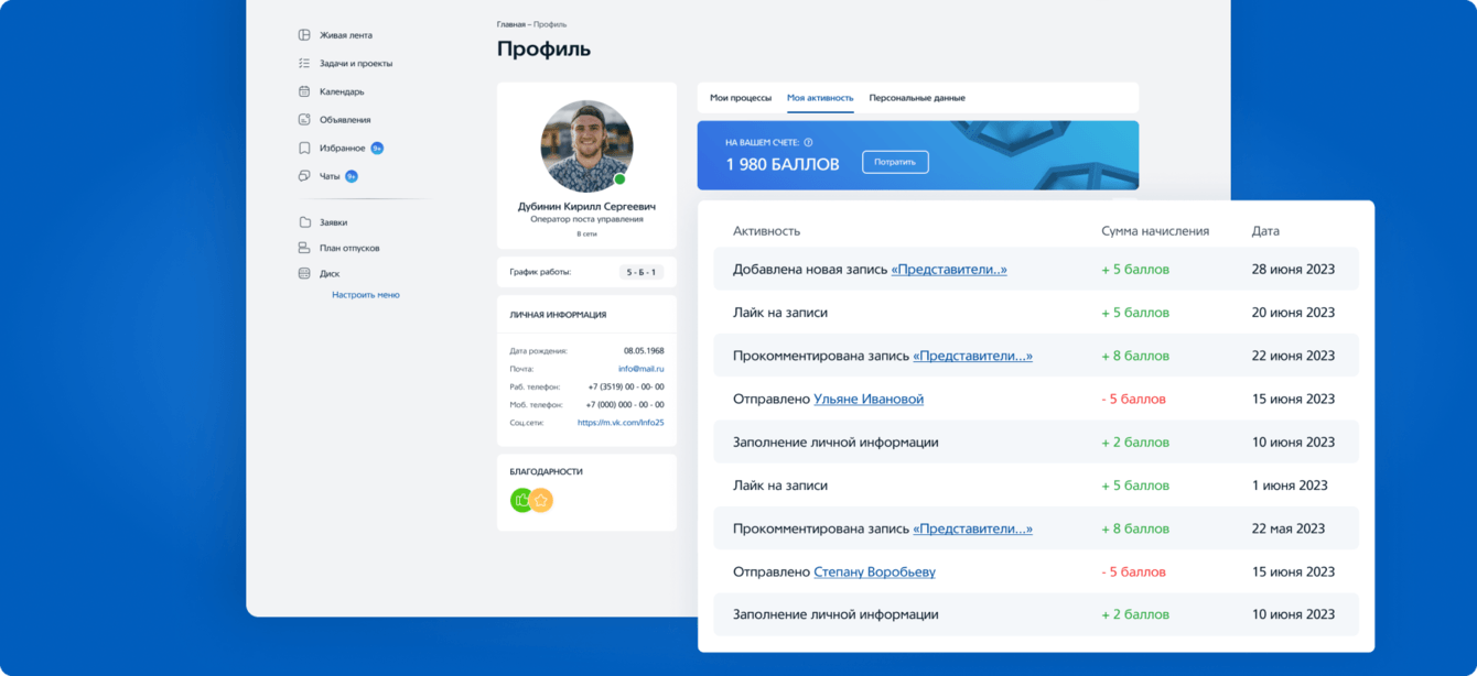 - Блок новостей сделан максимально удобным и информативным, чтобы сотрудники могли легко узнавать о последних событиях в компании, публиковать новости своих подразделений