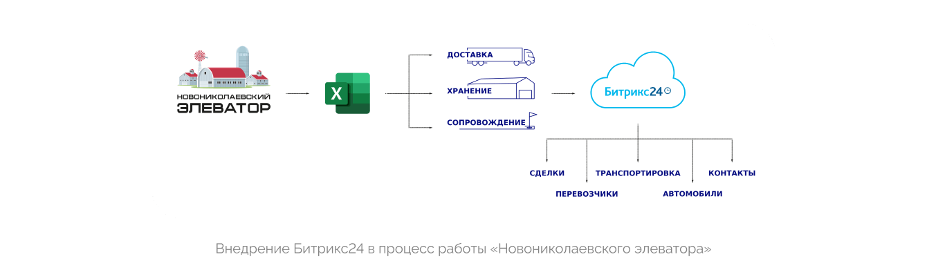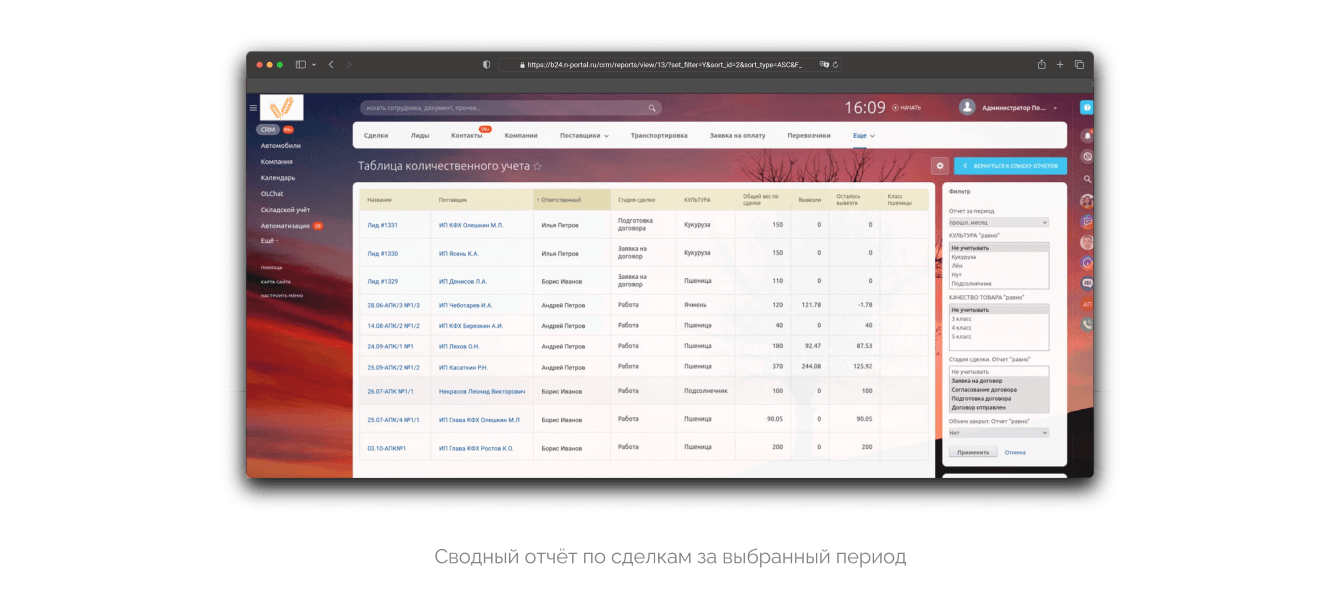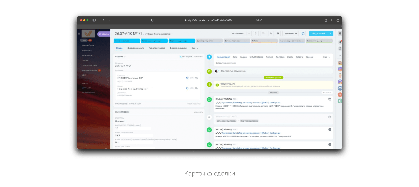 Для оперативной обработки сделки по покупке и транспортировке сельхозпродукции необходимо было автоматизировать все ее этапы – от получения заявки до оформления закрывающих документов. Как только заводится карточка сделки, запускается бизнес-процесс по ее сопровождению, вся актуальная информация, включая документы, согласования, переписку, записи звонков, доступны из карточки. Весь процесс закупки отображается графически, карточка перемещается по этапам работы, руководство компании может в любой момент отследить ее состояние. На последнем этапе собираются закрывающие документы и аналитические данные, которые переносятся в таблицу.
