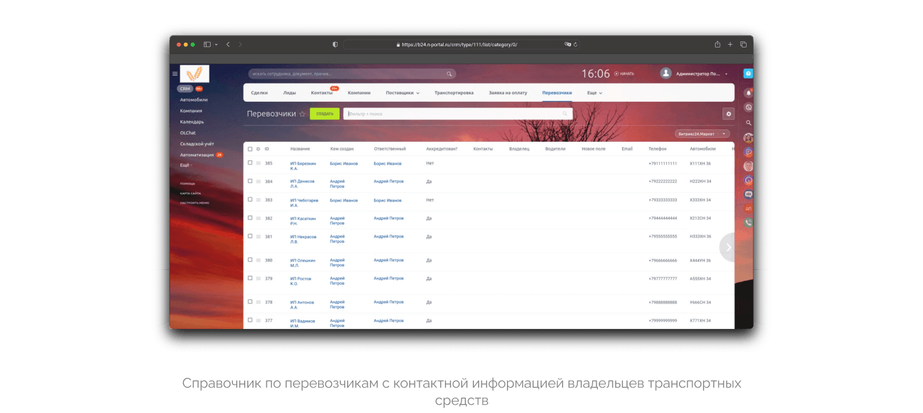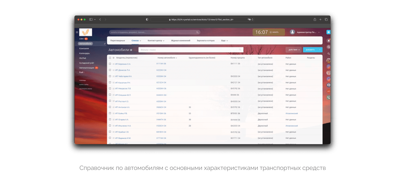 Основные рабочие справочники – по автомобилям и культурам. Справочник по автомобилям позволяет подобрать транспорт под конкретный груз и содержит информацию о номере, владельце, местоположении, контактах, грузоподъемности и т.д. Менеджер может фильтровать грузовые автомобили по необходимым параметрам, чтобы обеспечить максимально эффективную перевозку груза. Были написаны смарт-процессы, например, для выбора подрядчика для транспортировки груза по заданным параметрам. Сложность этого модуля состояла в том, что его нельзя было собрать стандартными инструментами Битрикс24, необходимо было писать свой код на PHP. Кроме того, в смарт-процессы были добавлены пользовательские поля.