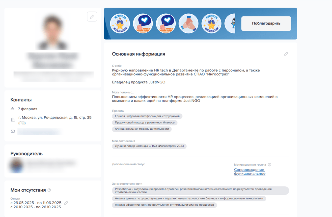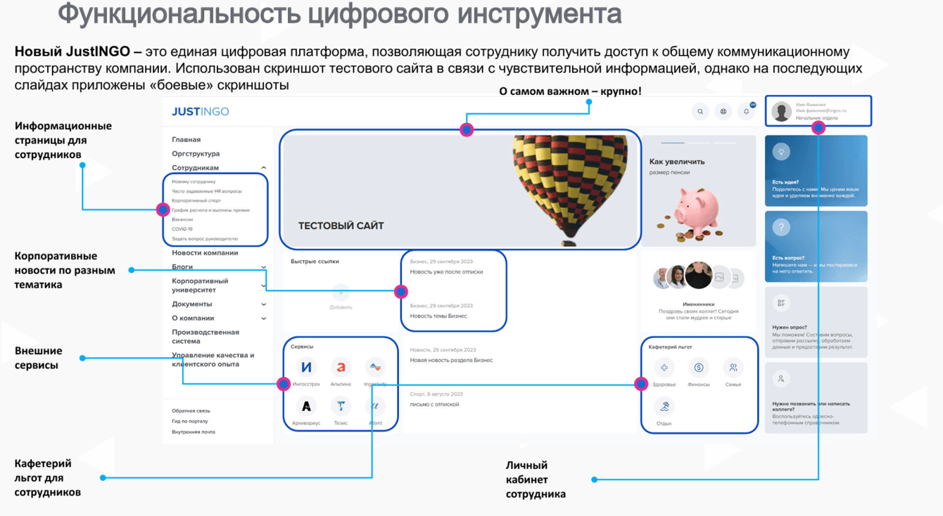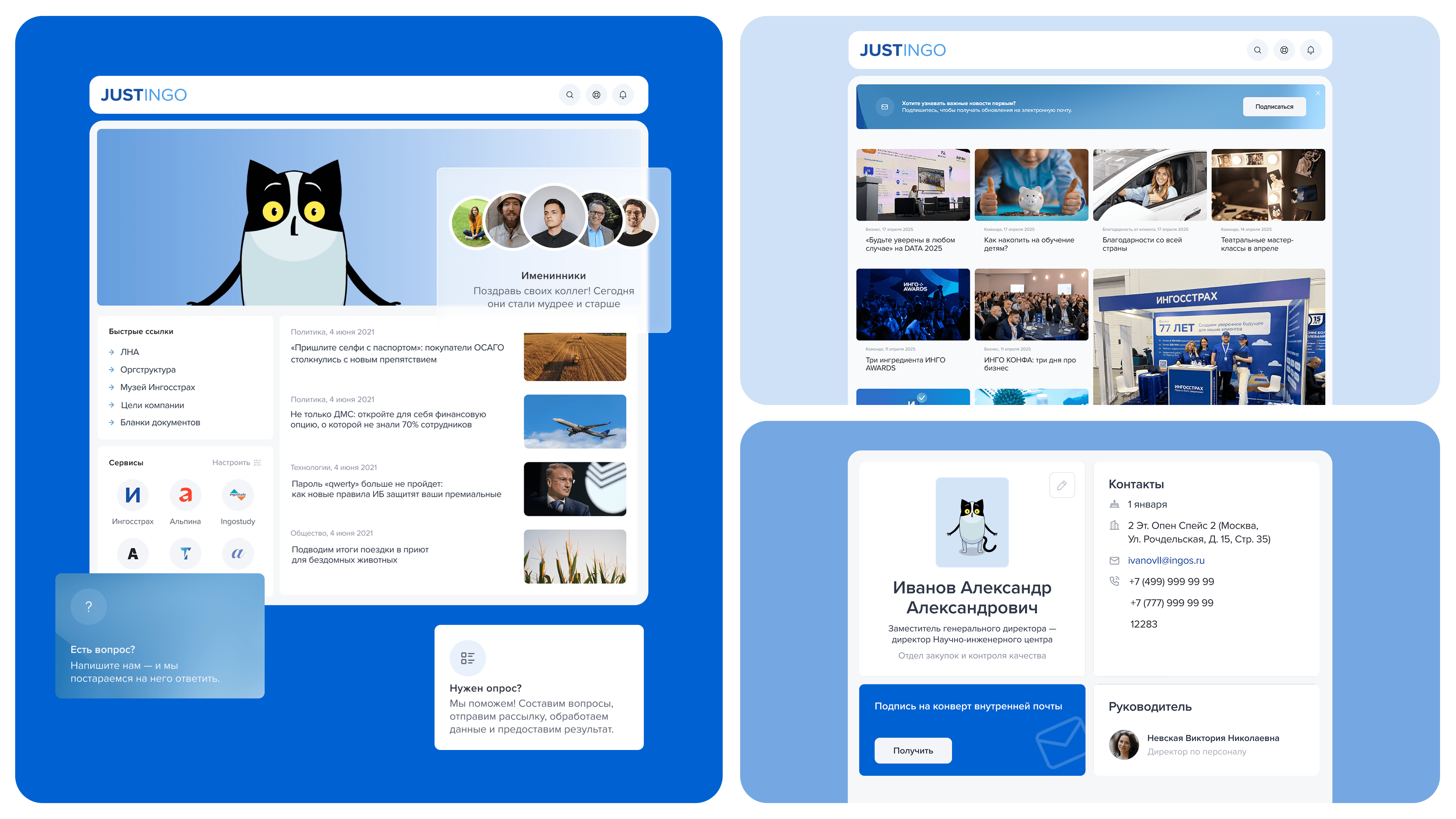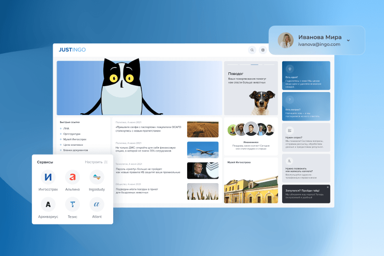 Новый корпоративный JustINGO — это не просто обновление интерфейса, это качественно новый уровень коммуникаций и эффективности для всех подразделений "Ингосстраха". Мы оценили системный подход коллег из "Лоции": они смогли объединить сложную логистику внедрения с человекоцентричным подходом. Мы благодарны команде проекта за продуктивную работу, открытость к задачам высокой сложности и способность находить элегантные решения даже для самых нетривиальных запросов. Так цифровое развитие выходит на совершенно новый уровень.
