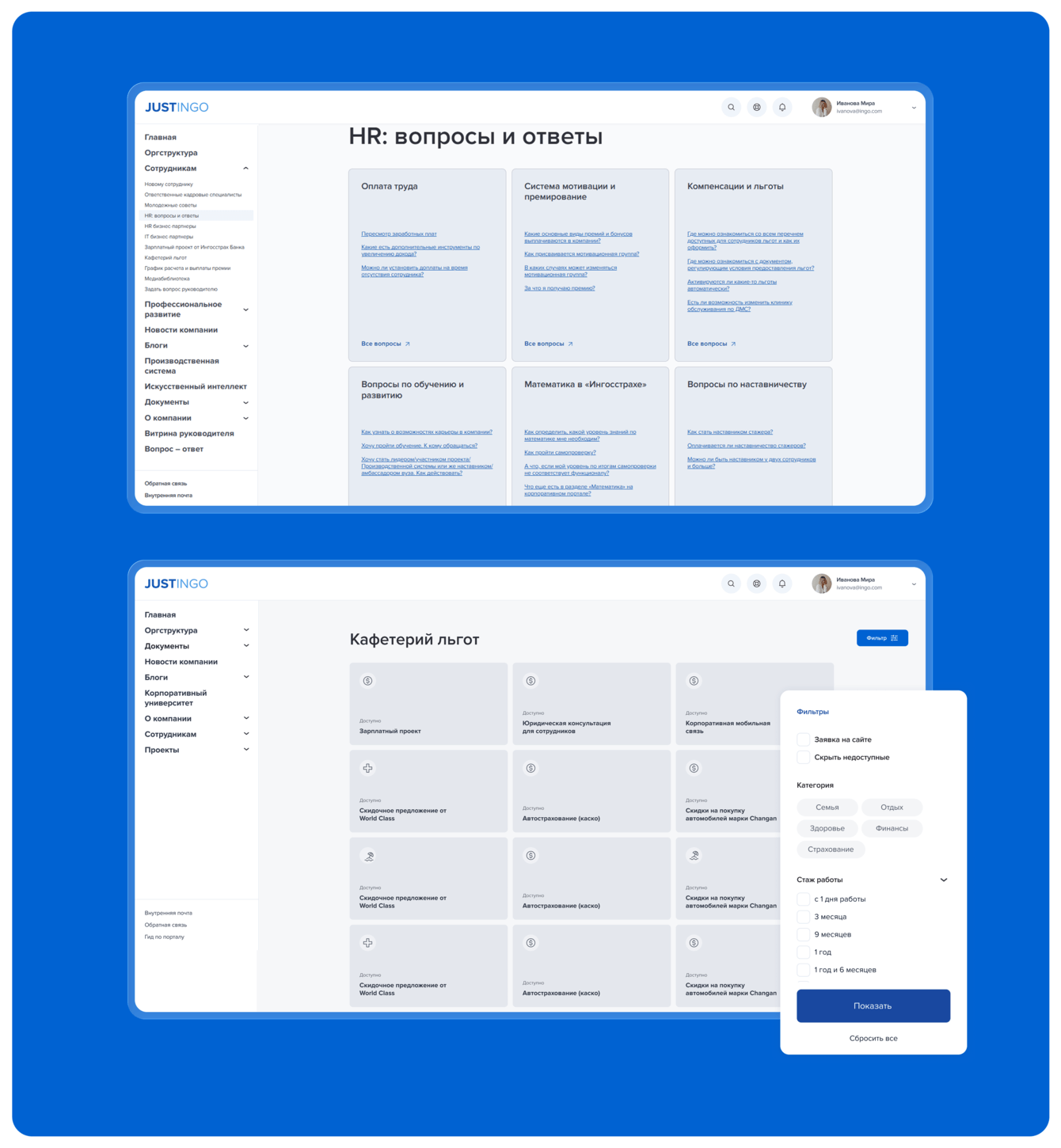 • Чат-бот «Ингопомощь»: встроенный ассистент для решения типовых кадровых и юридических вопросов.