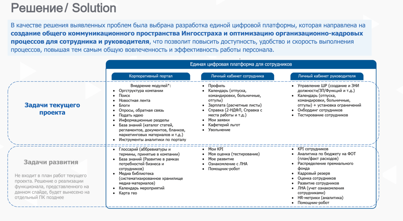 К моменту старта проекта корпоративный портал «Ингосстраха» морально и технически устарел. Он не справлялся с задачами эффективной коммуникации и автоматизации HR-процессов для компании с более чем 10 000 сотрудников.