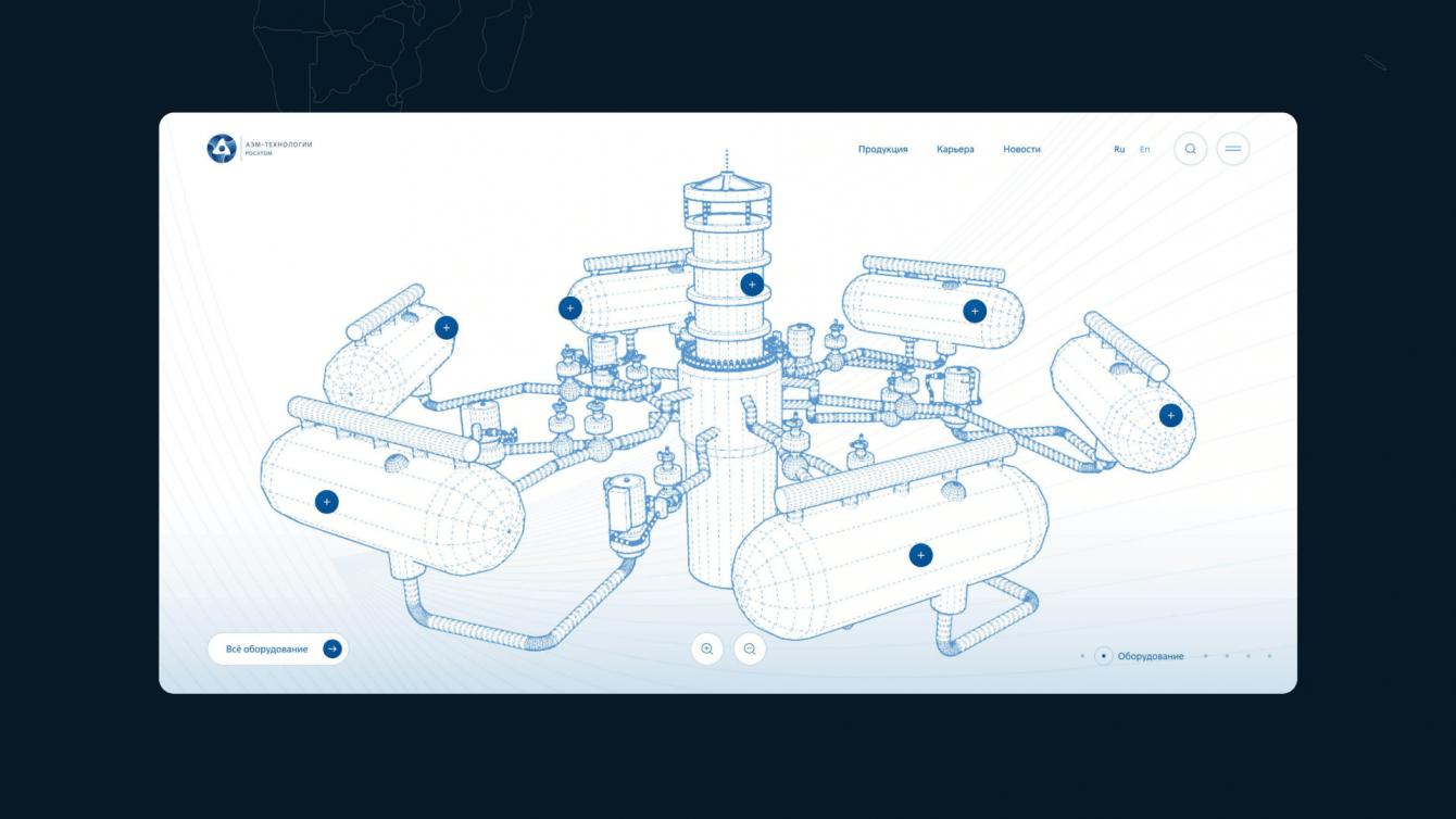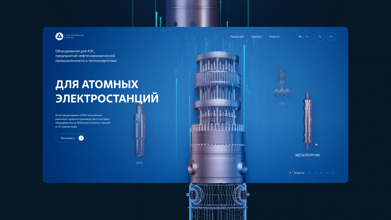 Целевая аудитория проекта — российские и иностранные профильные специалисты, которые хорошо осведомлены в тематике. Учитывая это и имиджево-информационную направленность сайта, команда проекта решила сделать основной точкой входа интерактивную 3D-презентацию, в которой наглядно представлены основные продукты компании — оборудование для АЭС, нефтегазохимии, теплоэнергетики и металлургии.