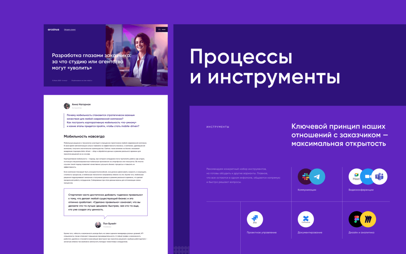В процессе подготовки контента мы провели десятки интервью с разными специалистами arcsinus, многое поняли и вскрыли несколько проблем — например, разночтение терминов или разное представление об отдельных процессах внутри компании.