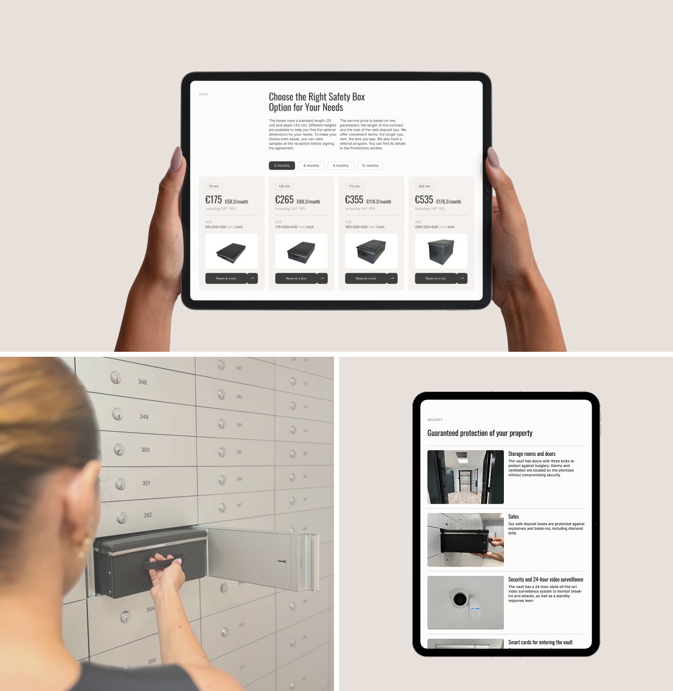 При выборе цветовой палитры решили отойти от классического «золотого» образа, который часто используют хранилища. По цветам изначально рассматривали решение в стиле каменной крепости — с преобладанием серых оттенков. Вместо этого подобрали пастельные оттенки, создающие ощущение спокойствия и доверия. Контрасты были продуманы так, чтобы направлять внимание пользователя на ключевые элементы.