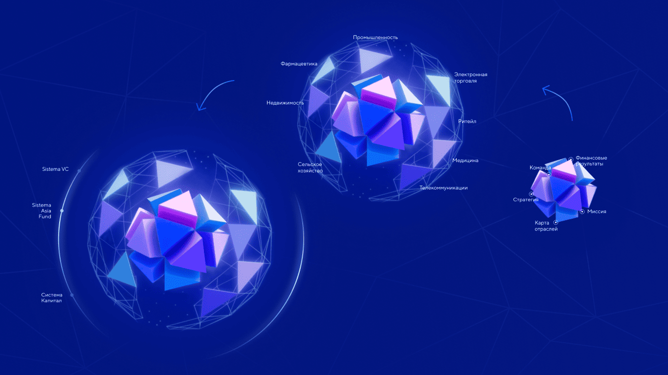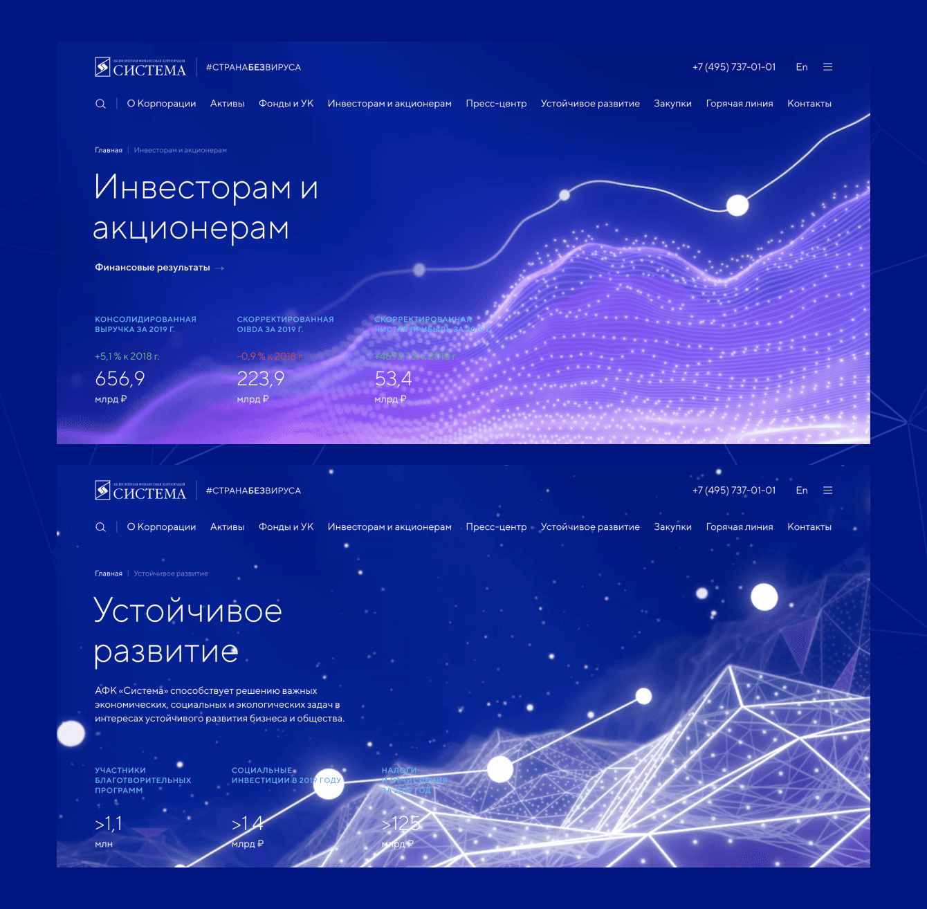 Рассказали о главных проектах корпорации и отразили в дизайне масштаб её бизнеса. Показали активы, фонды и технологические стартапы, которые развивает корпорация.