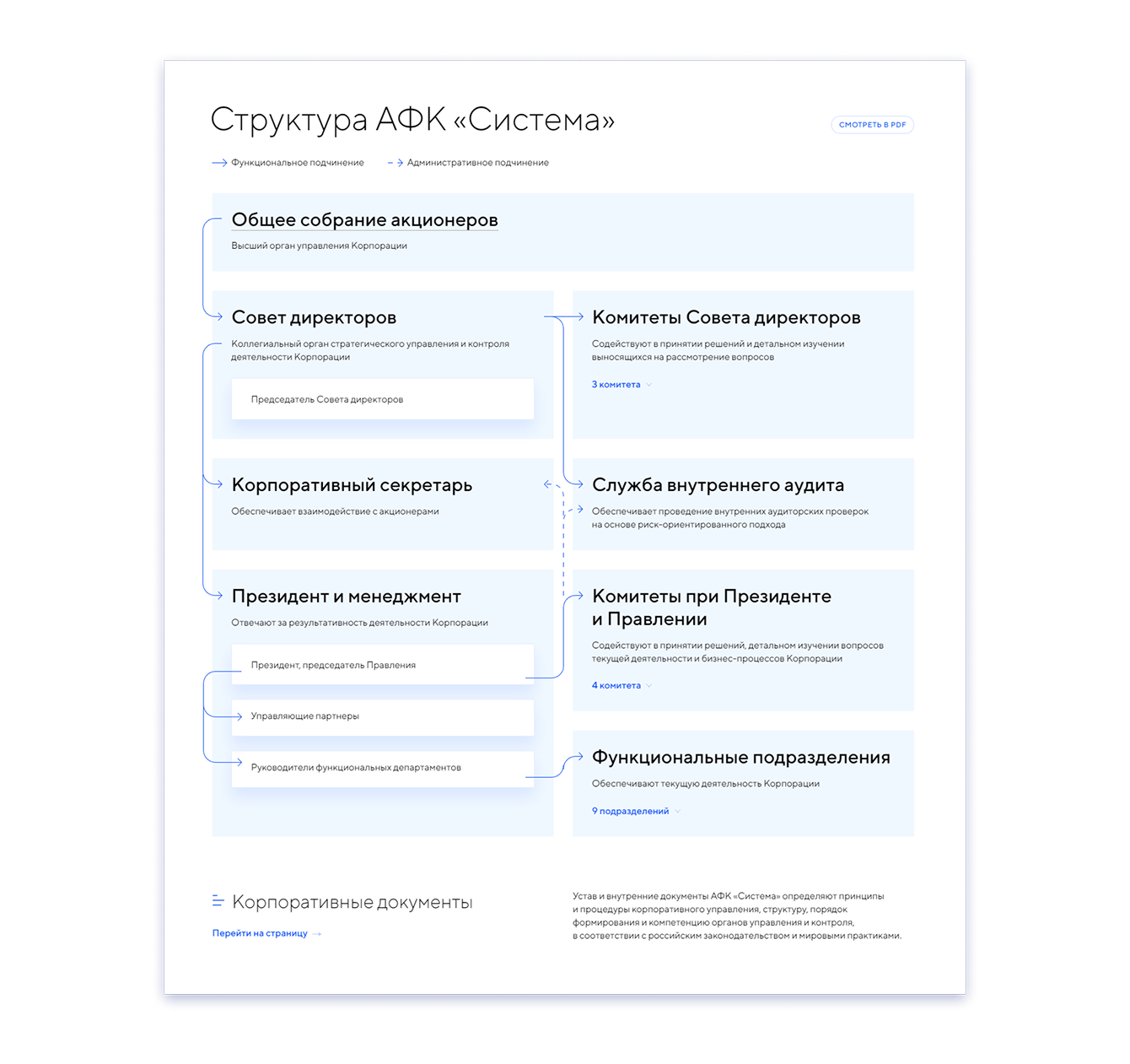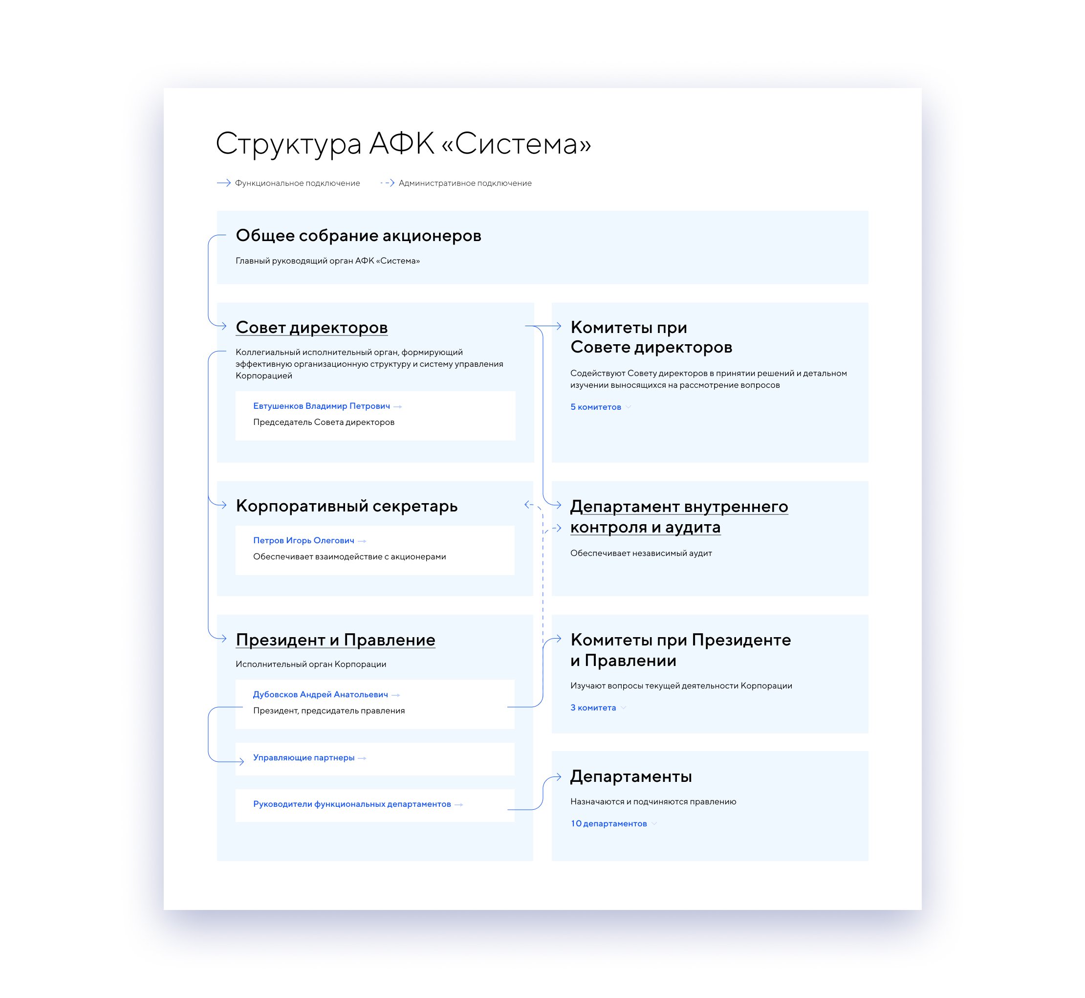 Уложили сложную структуру АФК «Система» в простую схему, показали связи между подразделениями и рассказали, чем они занимаются.