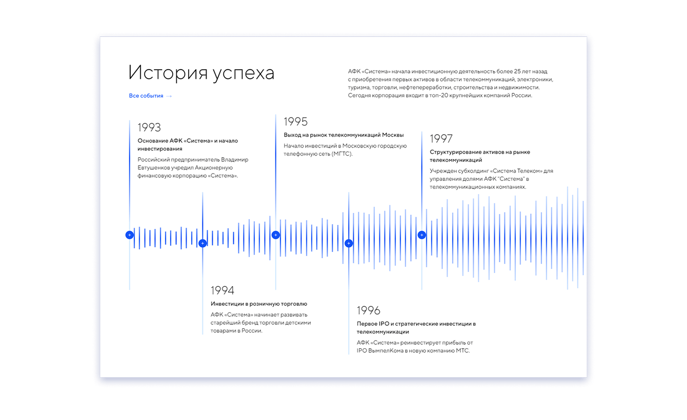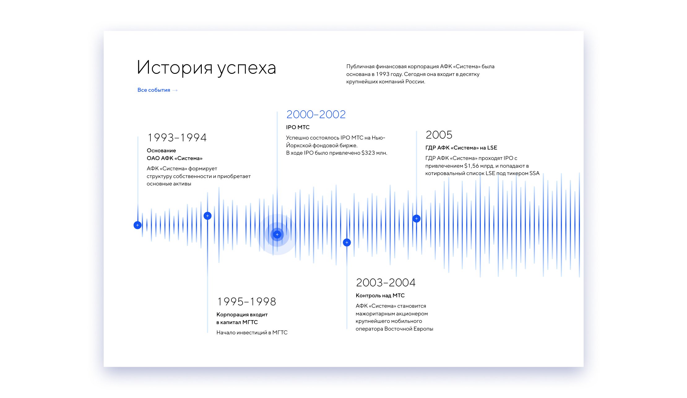 Показали историю успеха корпорации в виде звуковой волны, которая усиливается с ростом компании.