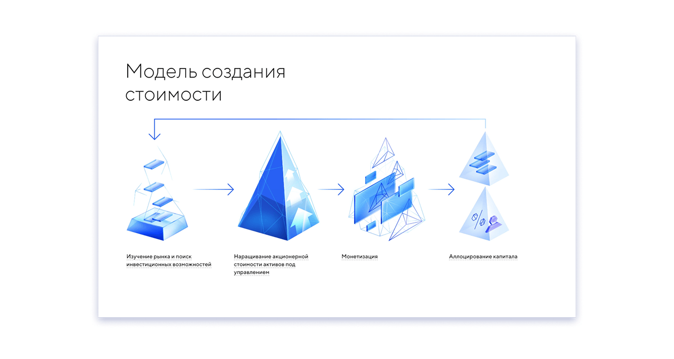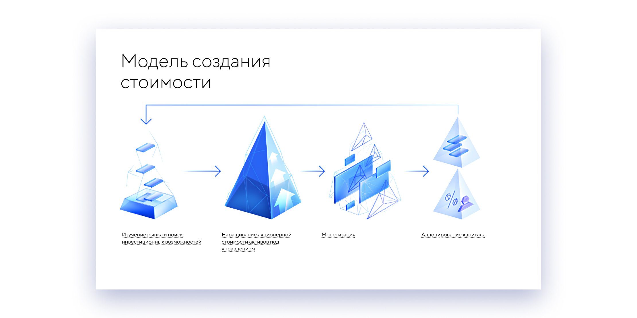 Наглядно рассказали о принципах работы корпорации. Проиллюстрировали модель создания стоимости и разложили её на четыре этапа.