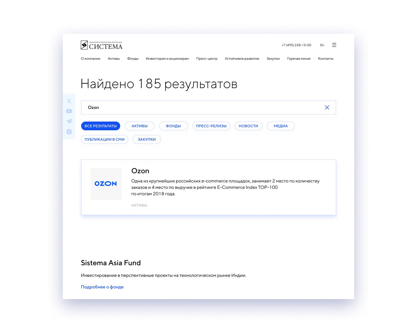 Продумали удобный поиск на сайте, чтобы пользователи могли быстро найти нужную информацию — пресс-релизы, финансовые отчёты, информацию о фондах и другое.