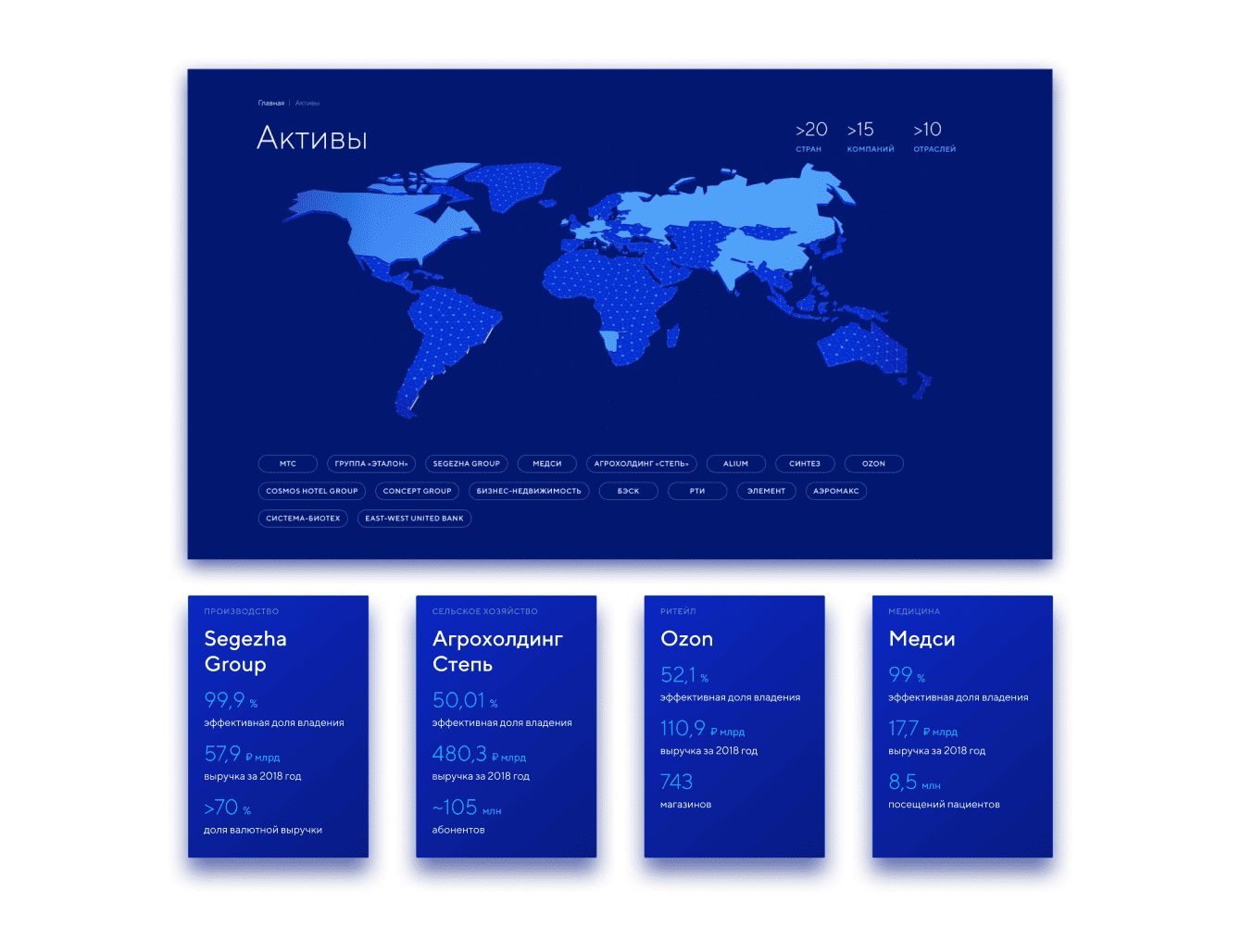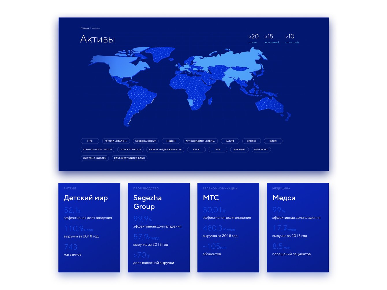 В активы компании входят системообразующие предприятия, мобильные операторы, медицинские и исследовательские центры, международные розничные сети, фонды и технологические стартапы.
