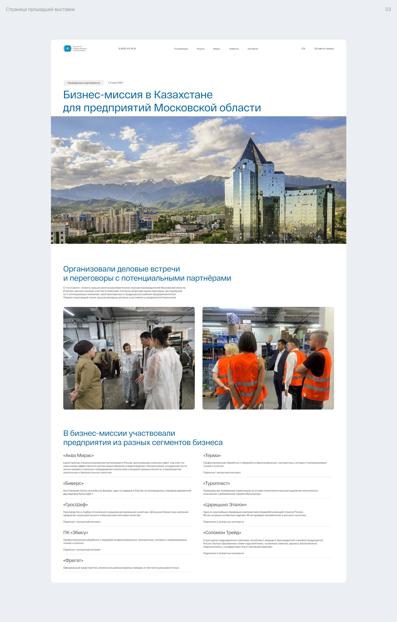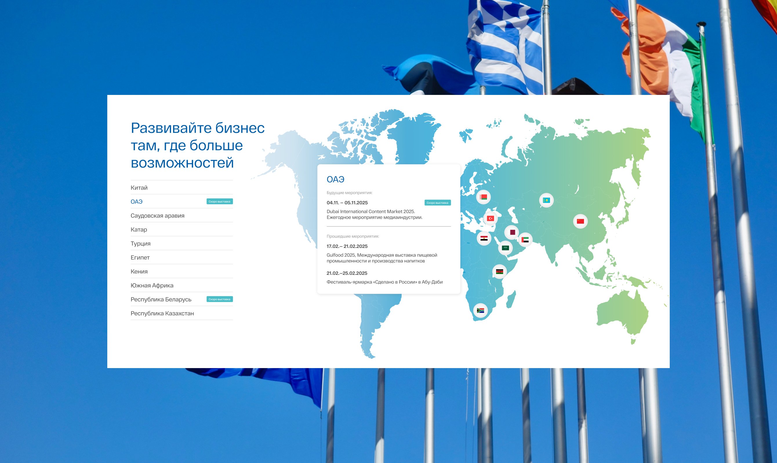 Добавили карту, объединяющую прошедшие и будущие мероприятия — наглядное решение для демонстрации географии деятельности компании. Пользователь может увидеть, где будет ближайшая выставка, а перейдя на отдельную страницу, ознакомиться с подробной информацией.