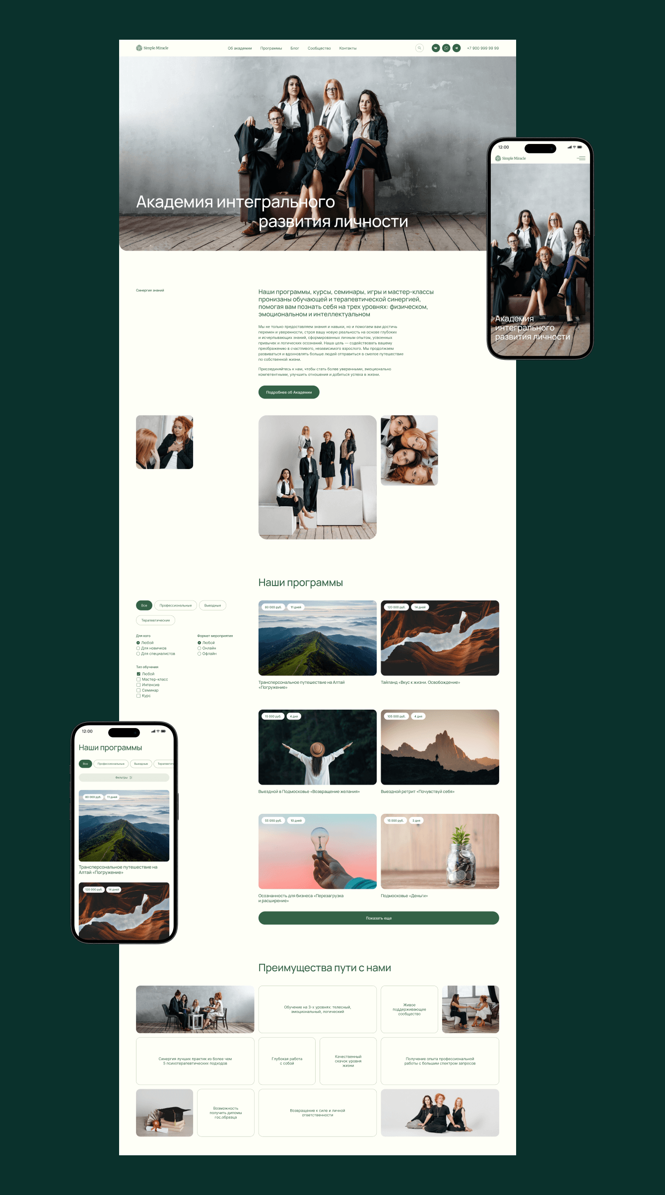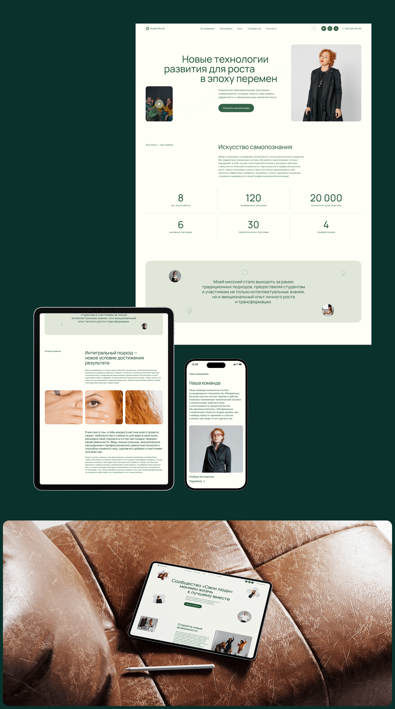 Сделать дизайн для сайта Академии интегрального развития личности — это программы, курсы, семинары, игры и мастер-классы, которые пронизаны обучающей и терапевтической синергией. Команда профессионалов, специализирующаяся на психологии, терапии и выездным курсам.