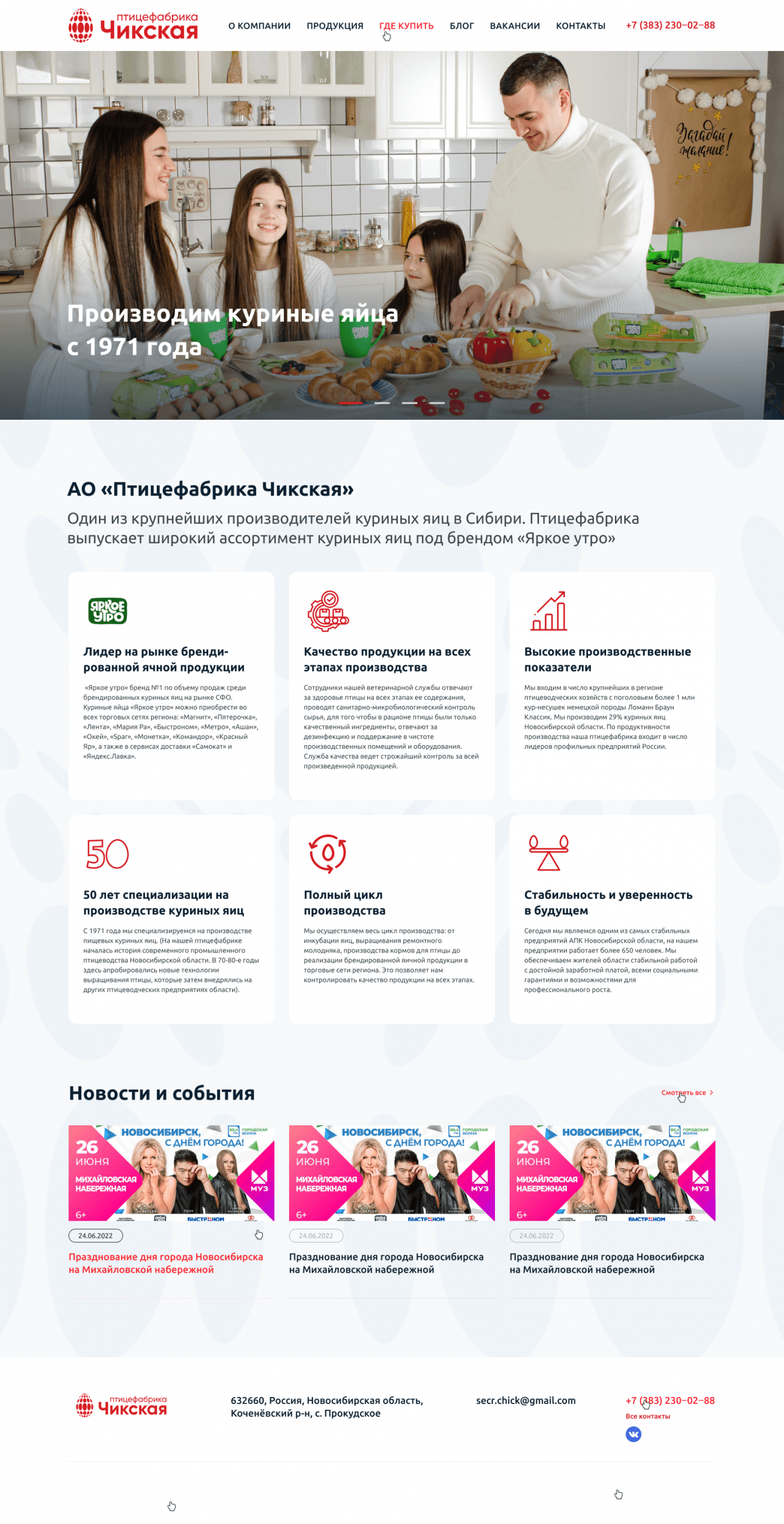 Создание сайта с добавлением удобной навигации. Разработка карты с регионами присутствия продукции. Размещение информации об организации, об истории образования фабрики, ее целях, преимуществах и достижениях. Публикация контактов организации. Добавление видео блога.