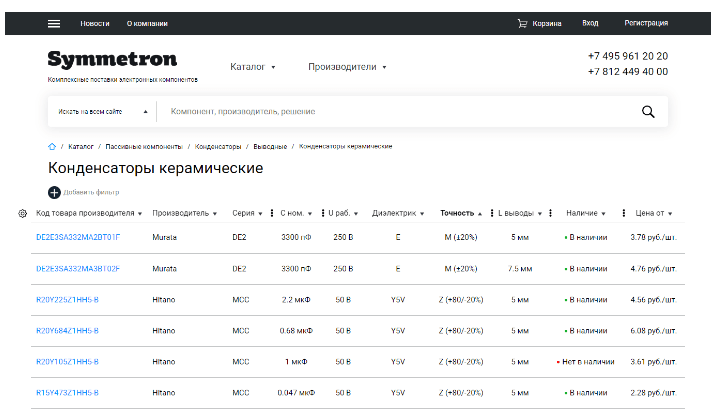На сайте доступен параметрический поиск по компонентам, производителям и решениям. Результаты отображаются ещё в процессе набора поискового запроса.