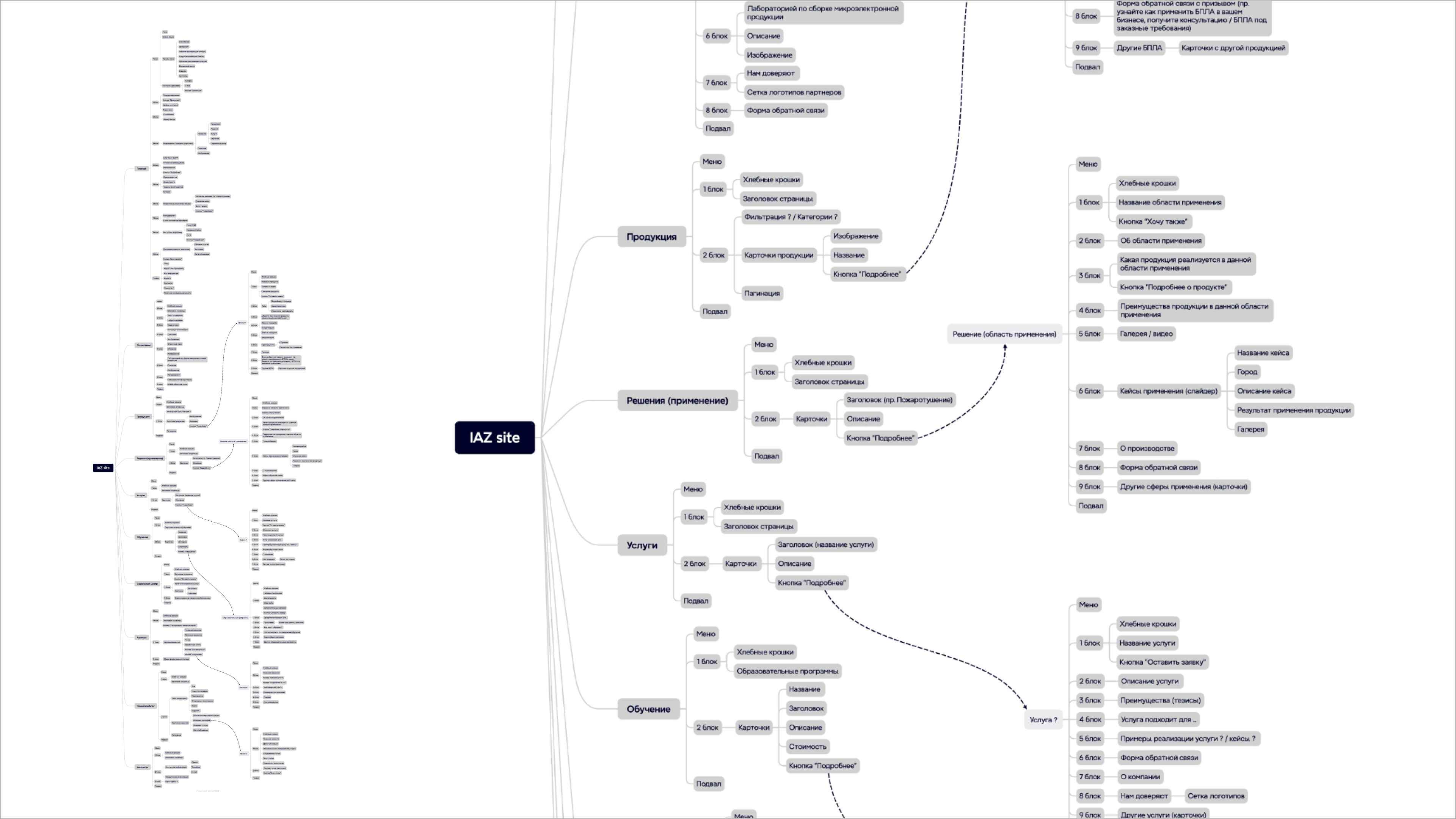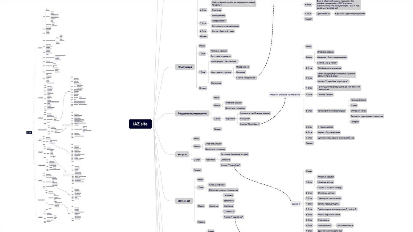 В ментальной карте мы учли все важные аспекты: иерархия страниц, уникальные шаблоны, а также расположение и функционал блоков.
