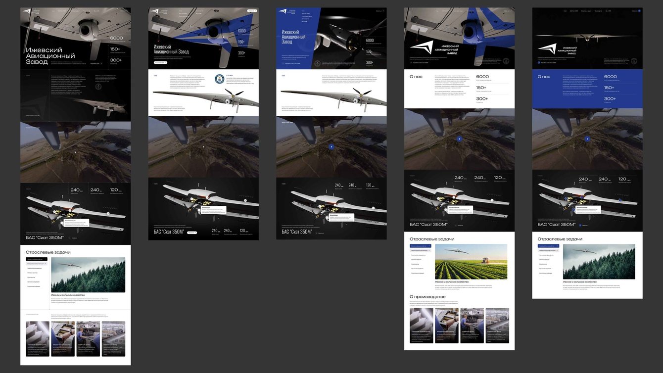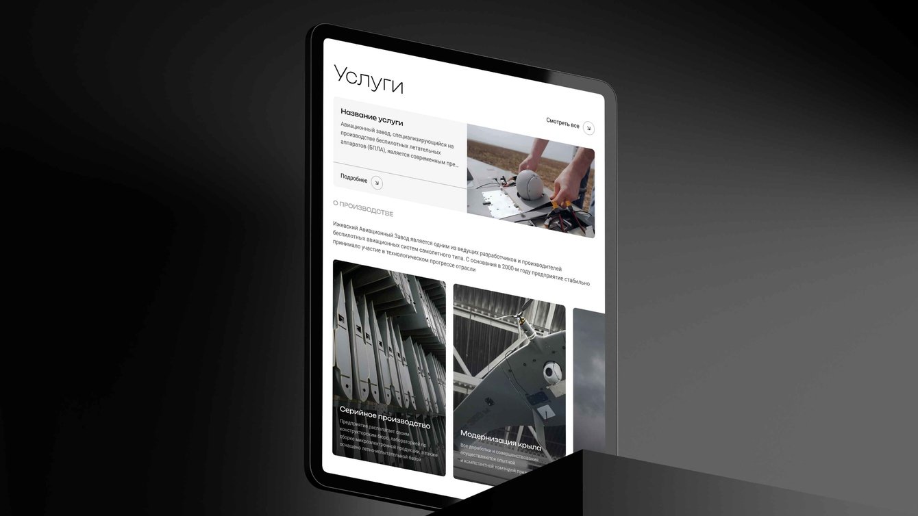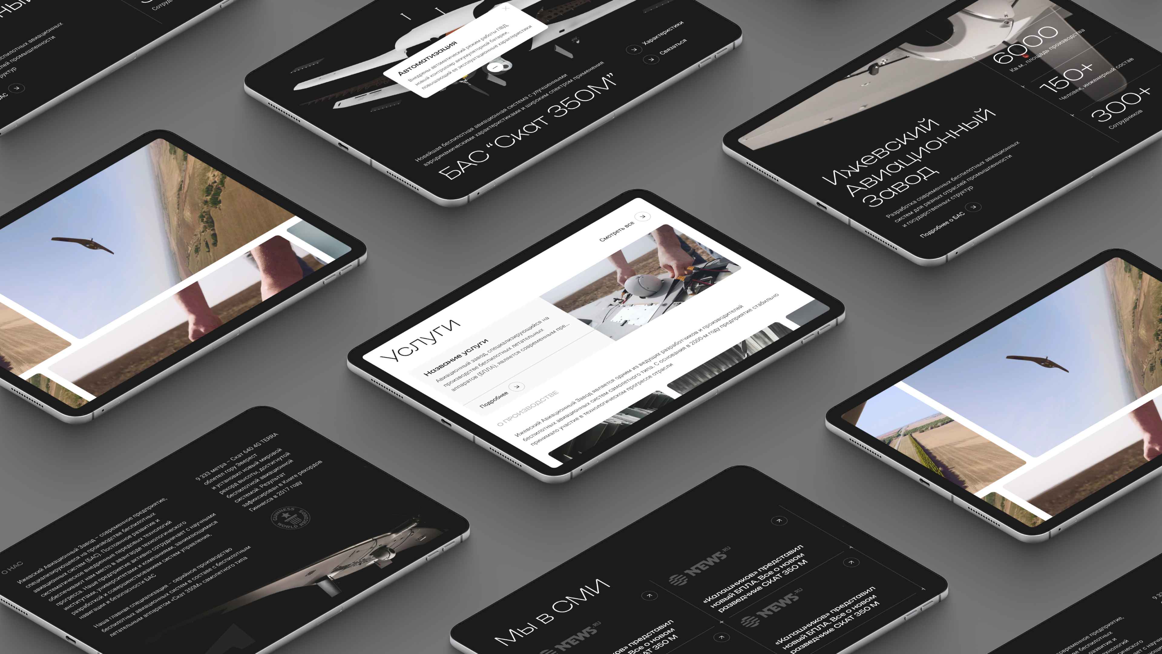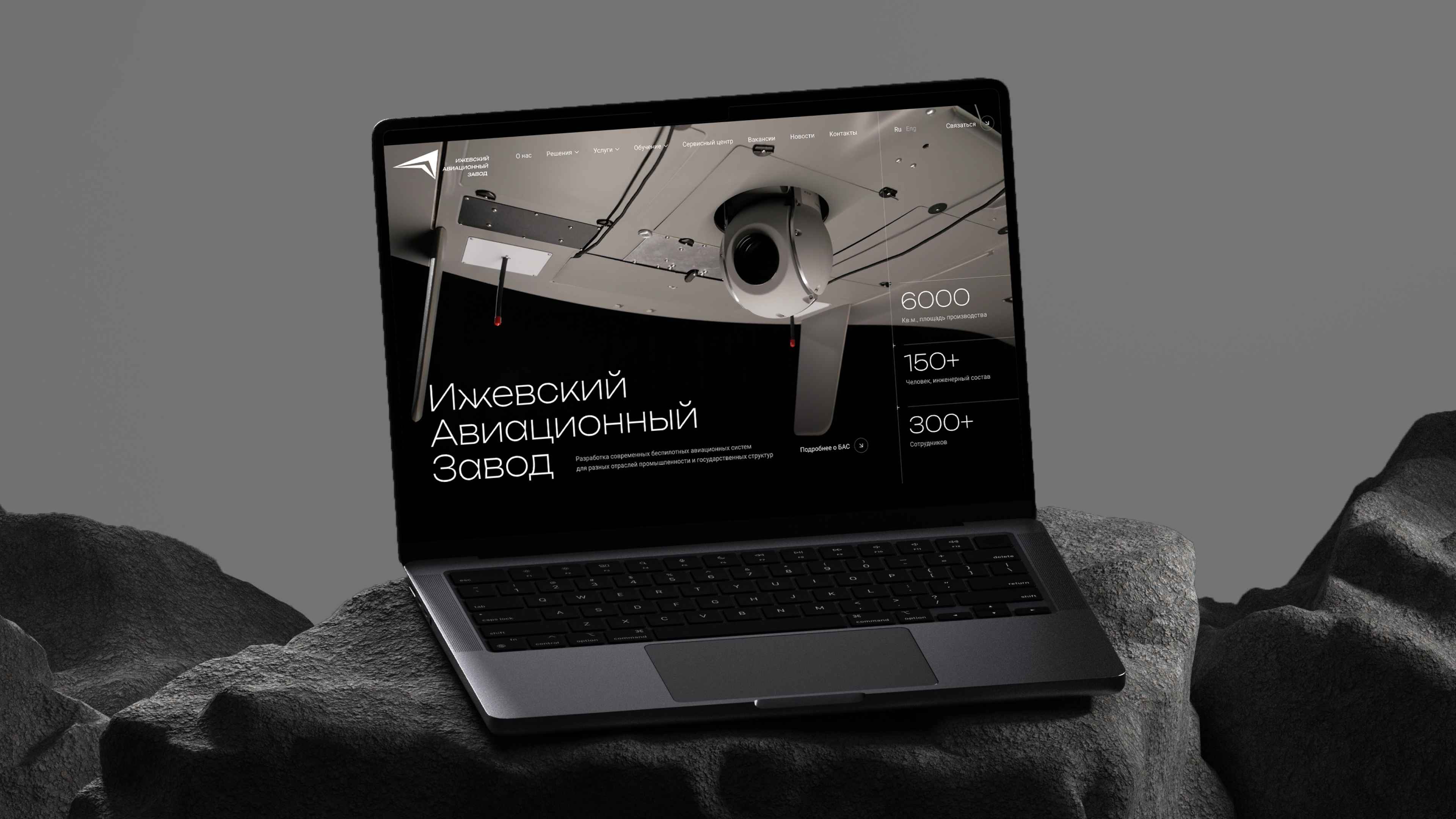 Ижевский Авиационный Завод является одним из главных поставщиков БАС и комплекса услуг, связанных с их эксплуатацией. Предприятие обратилось к нам с запросом на корпоративный сайт с расширенным описанием направлений деятельности и услуг. В течение подготовительного этапа мы изучили работу предприятия, собрали референсы и провели несколько брифинг-сессий