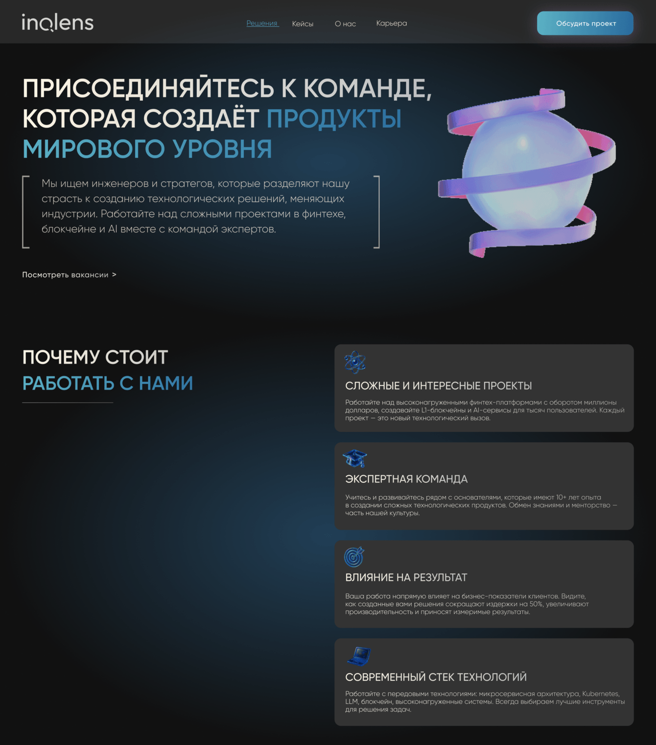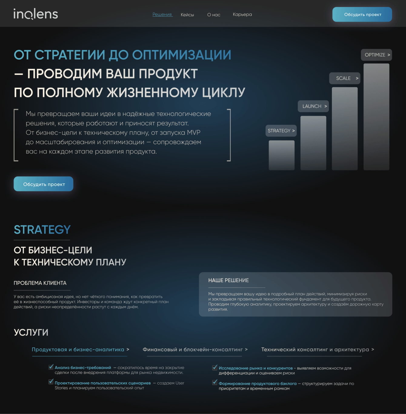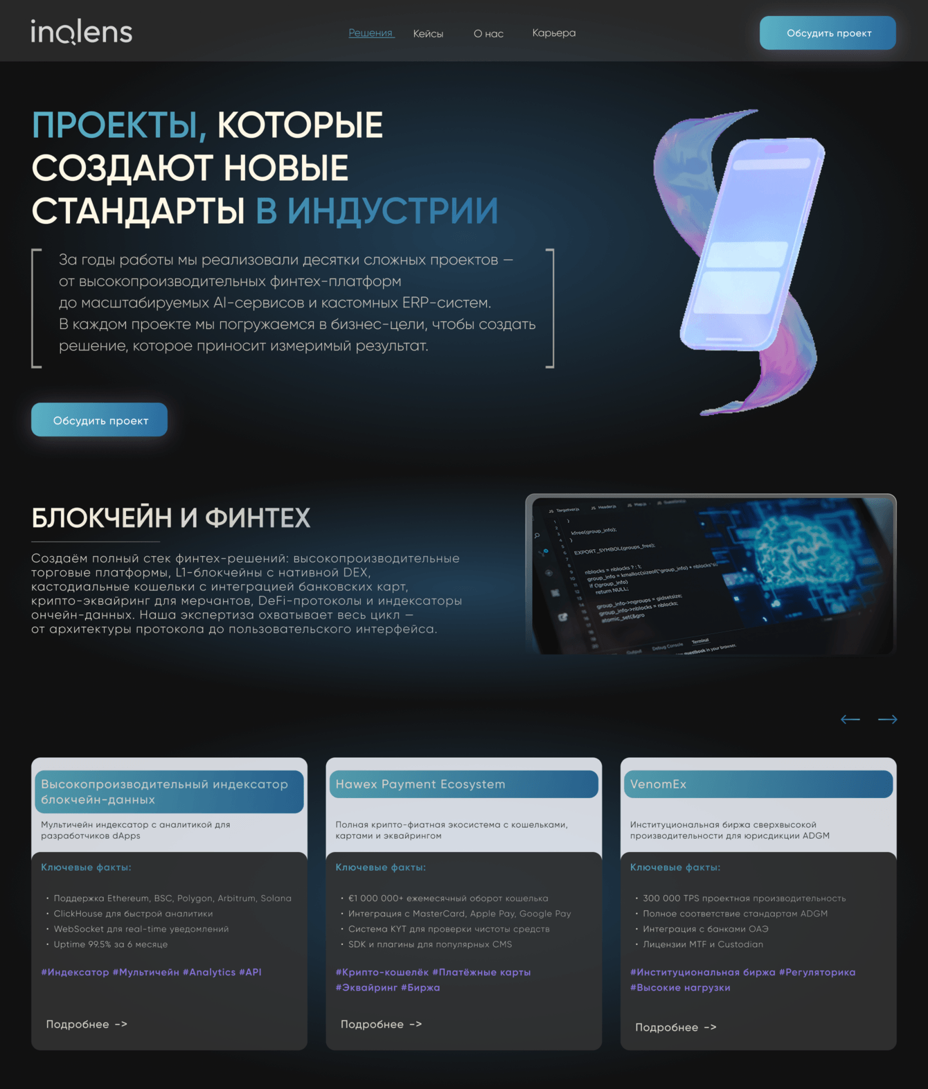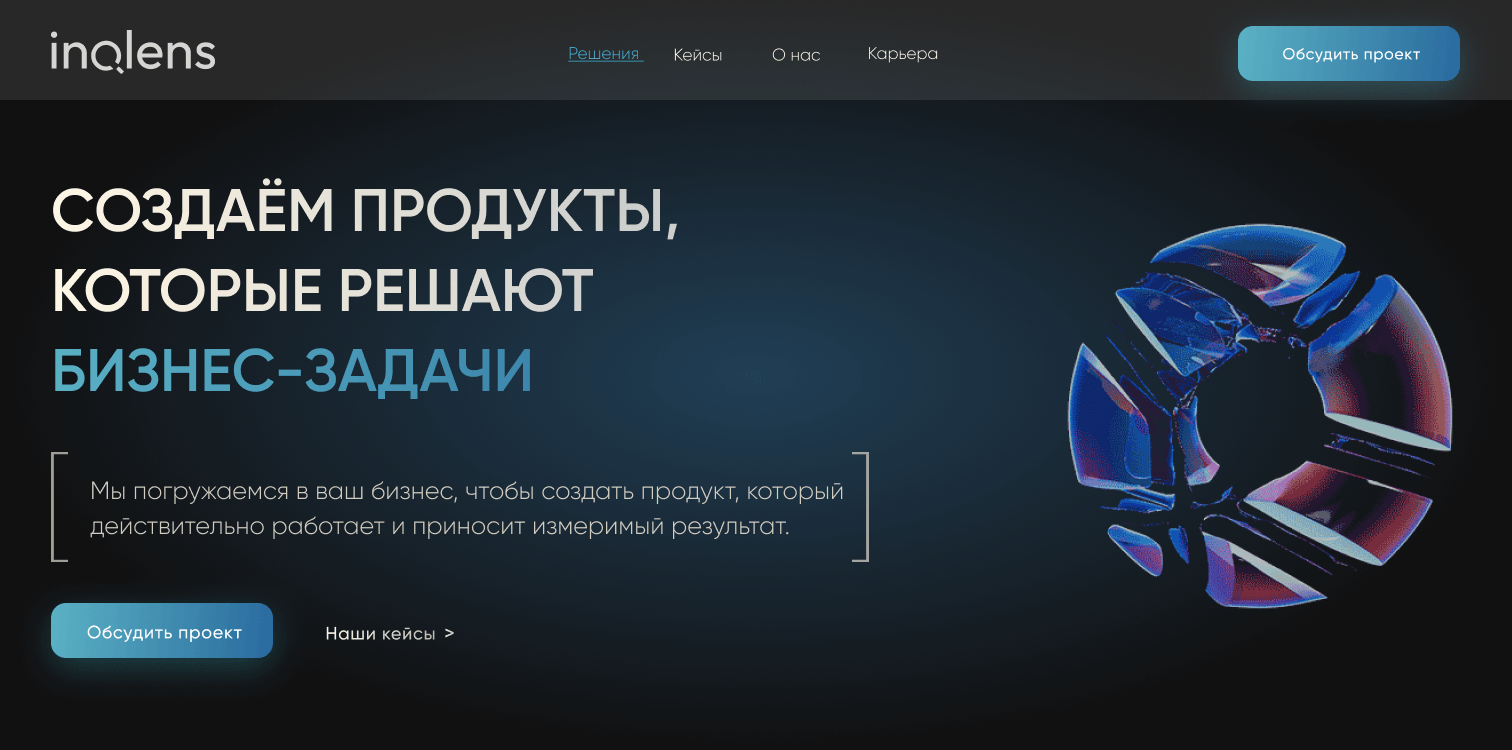 Для международной компании INQLENS, специализирующейся на развитии бизнеса и внедрении высокотехнологичных решений (Blockchain & FinTech, Искусственный интеллект и Big Data, ERP, CRM и автоматизация бизнес-процессов), был разработан современный многостраничный сайт.