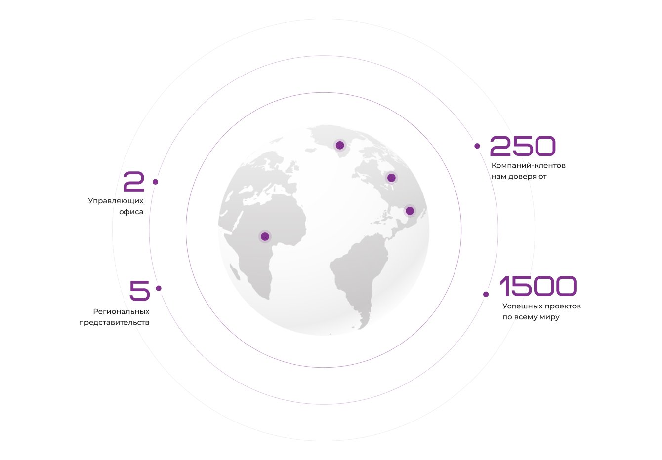 Подкрепляет слова основателя компании, а также подчёркивает масштабность корпорации и глобальность бренда интегрированный глобус с обозначенными точками — крупнейшими реализованными проектами. разработан с использованием технологий WebGL. Основные показатели успешности компании выведены на орбитах.