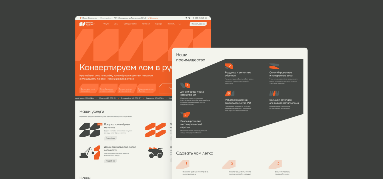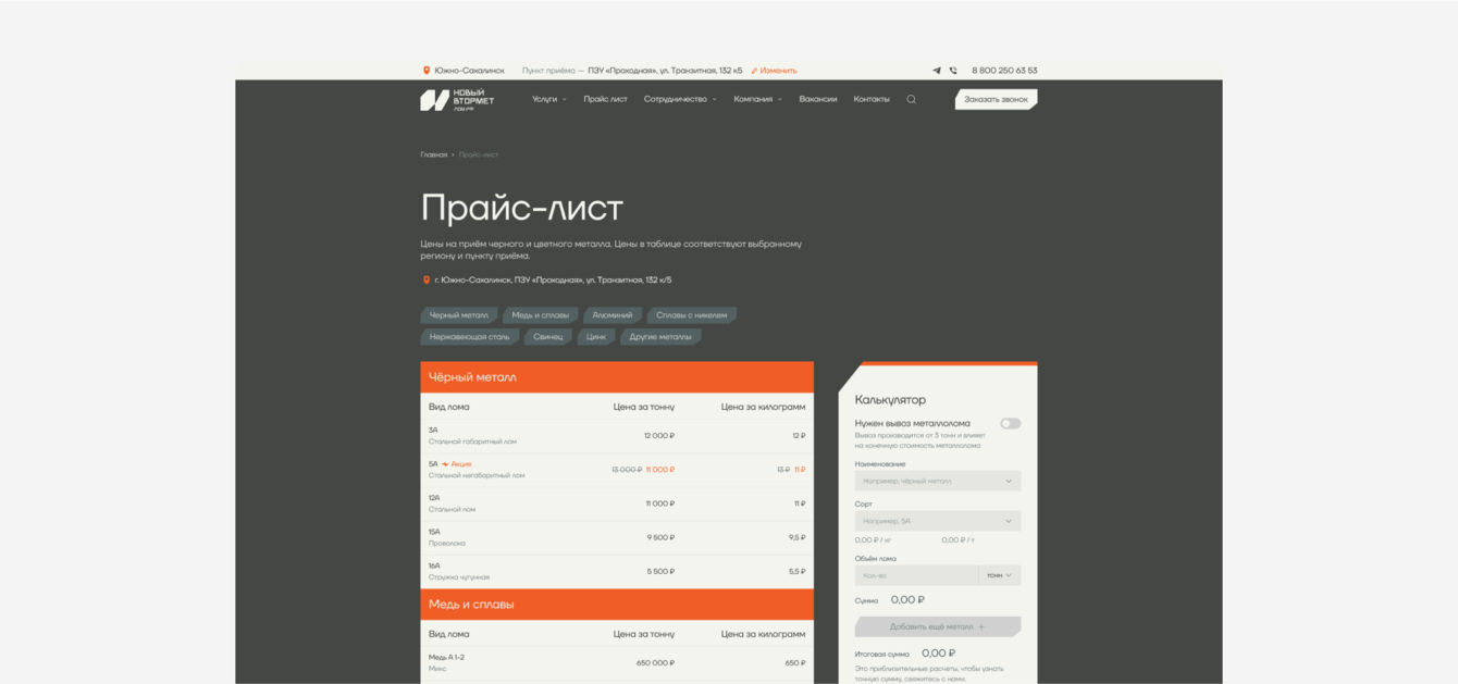 Новый сайт стал единой точкой входа для клиентов Втормета — на нём пользователи могут найти информацию об услугах и преимуществах, подобрать удобный пункт приёма лома. Калькулятор и прайс-лист позволяют узнать примерную стоимость лома разных типов.