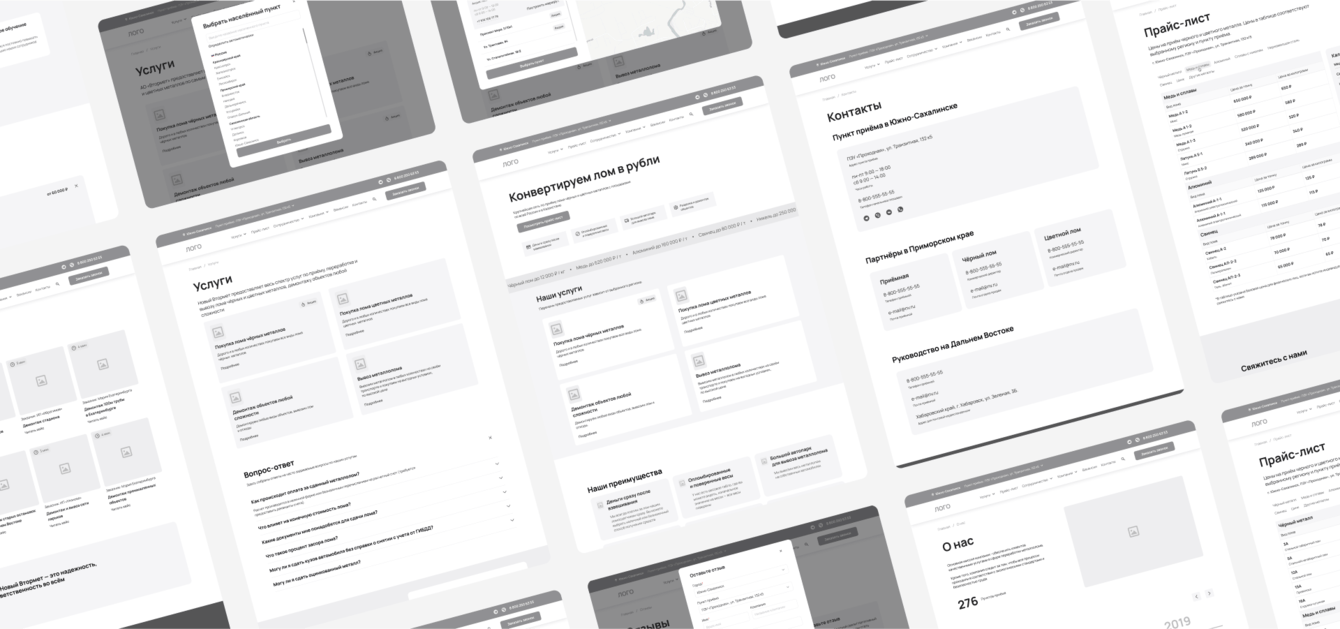 Кроме основных страниц сайта (например: главная, о компании, контакты) продумывали функционал и логику калькулятора, работу пользователя с прайс-листом и возможность выбора геолокации. Показывали на прототипах разные состояния и варианты этих частей интерфейса.