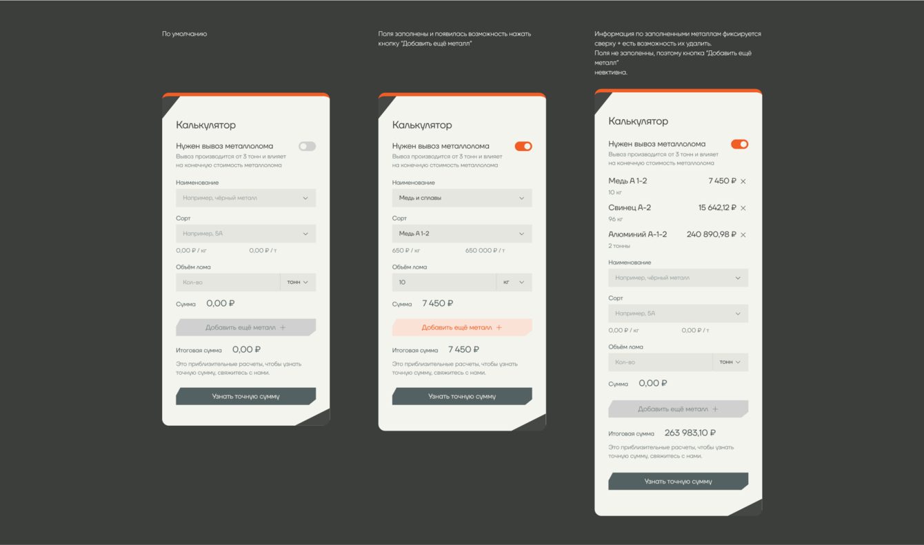Изначально в калькуляторе предполагалось всего 3 поля, но позже он превратился в подробный калькулятор, похожий на кредитный. С его помощью можно примерно понять, какие материалы и на какую сумму можно сдать. Предусмотрели возможность выбора услуги вывоза металла. От этого зависит итоговая цена.