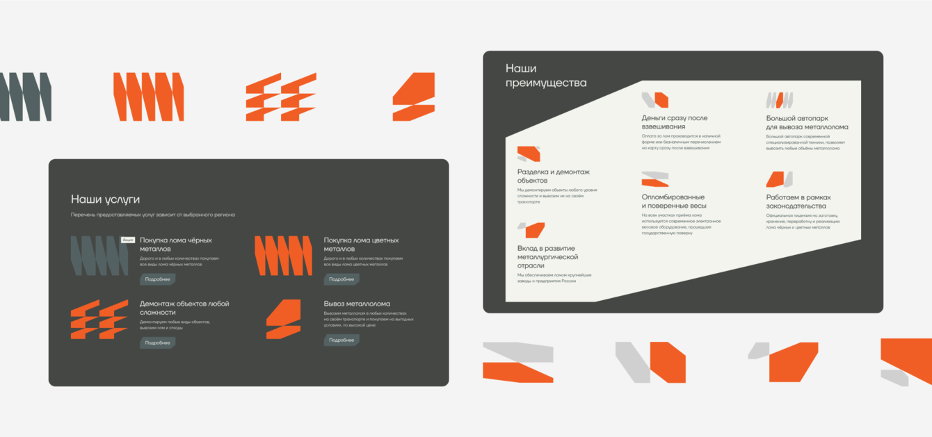 Иконки услуг и преимуществ стилизовали, используя лишь фирменные паттерны.