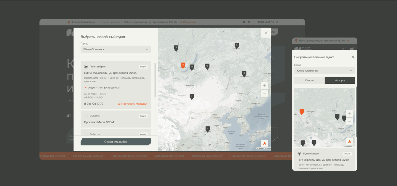 Функционал разместили в шапке сайта. Можно выбрать отдельно город и пункт приёма лома.