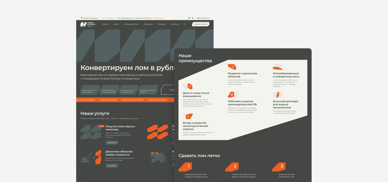 Кодинг выполнили на Битриксе. Особое внимание уделили проработке функционала определения геопозиции. Это ключевой момент, так как цены на лом и акции зависят от пункта приёма. При смене пункта изменяются цены в прайс-листе, поэтому требовалась ещё настройка автоматизированного обмена данными с 1C. Сделали полную настройку сервера и доменного имени.