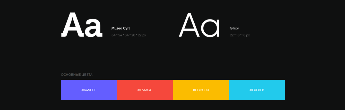Шрифтовая пара — элегантный Museo Cyrl и схематично-сдержанный Gilroy, сохраняющие атмосферу сайта как высокотехнологичной платформы.