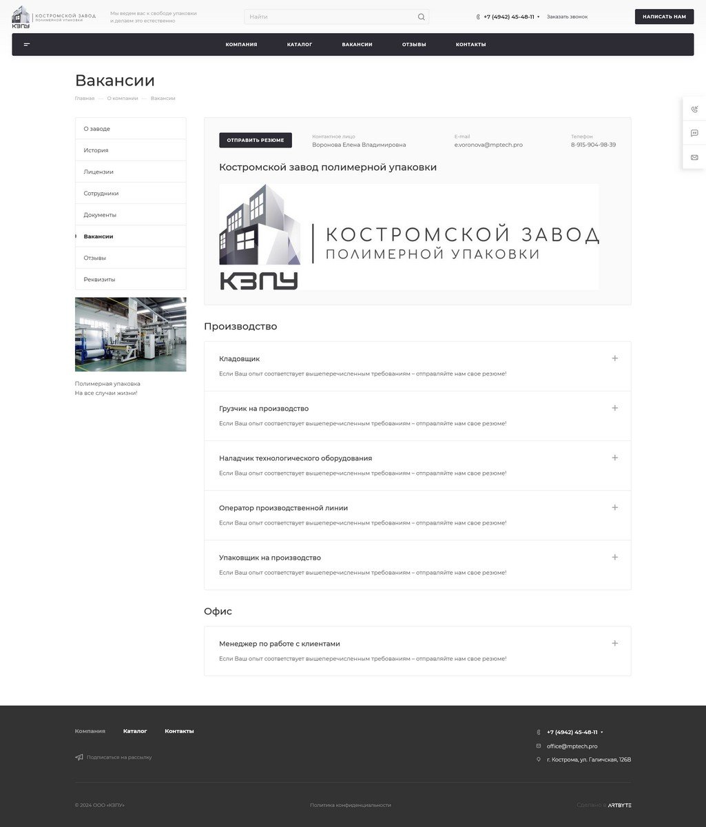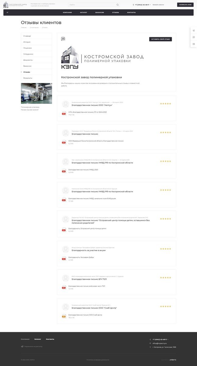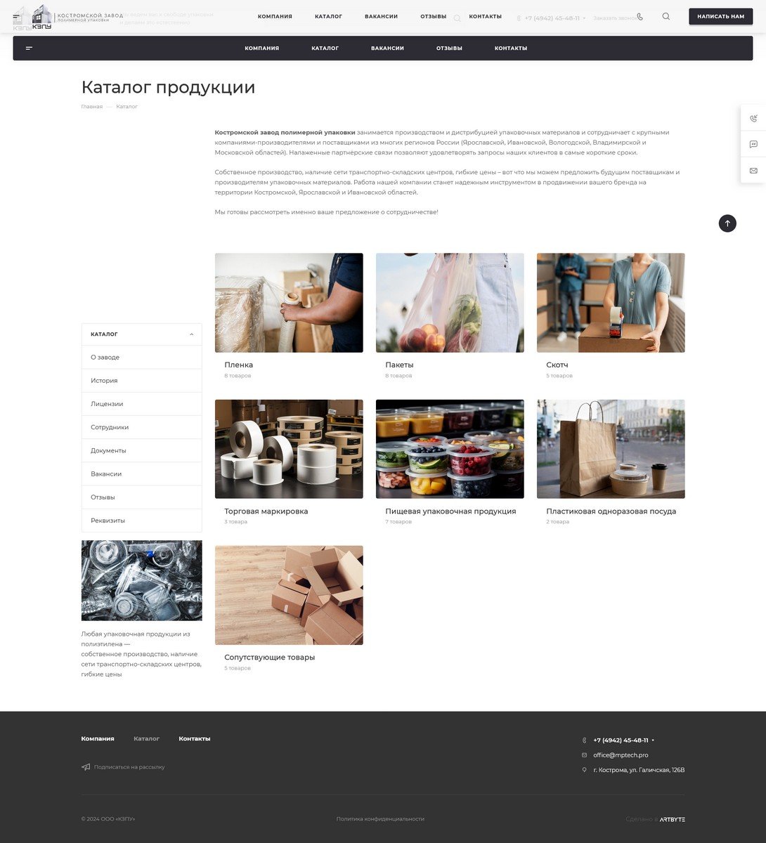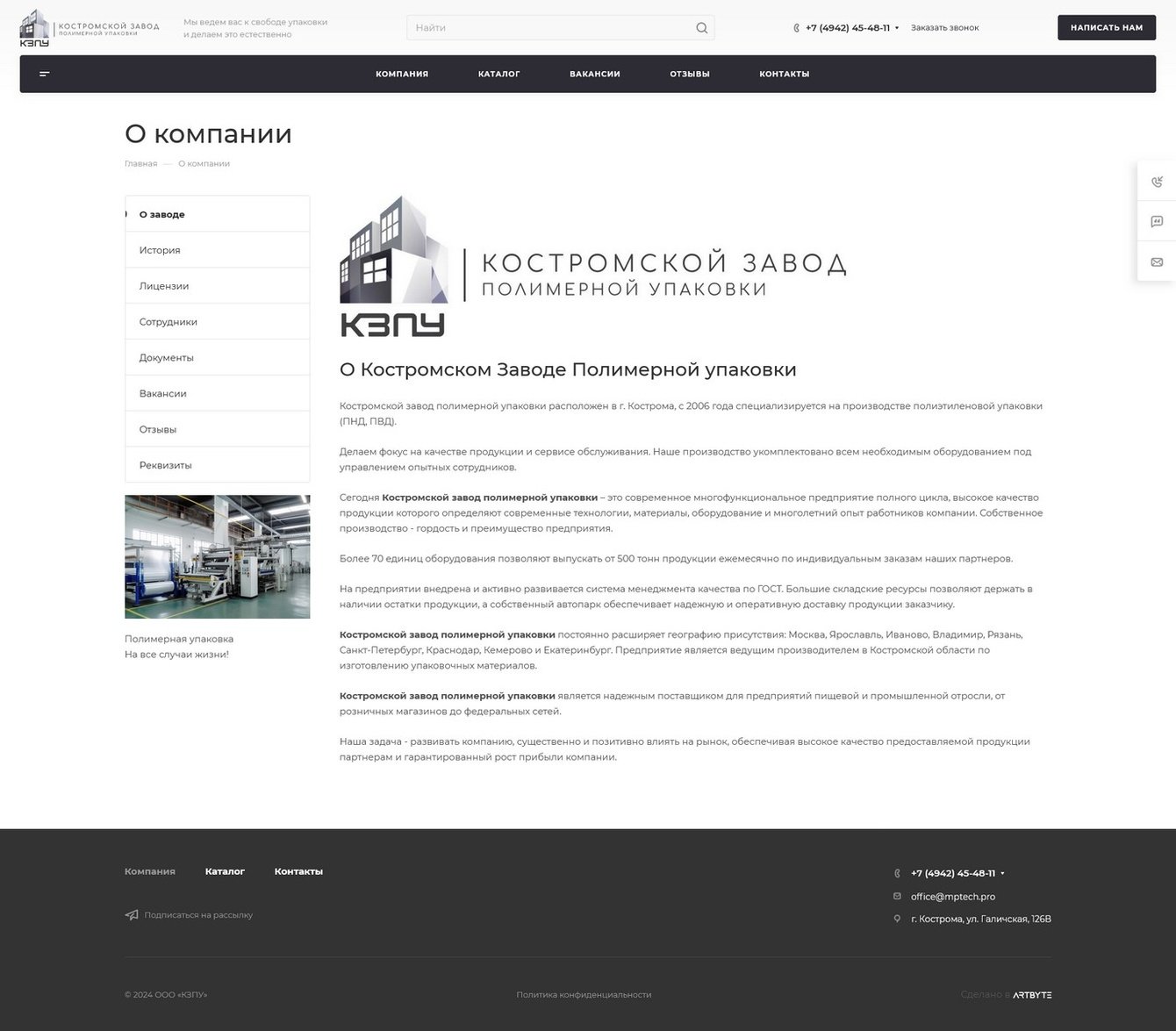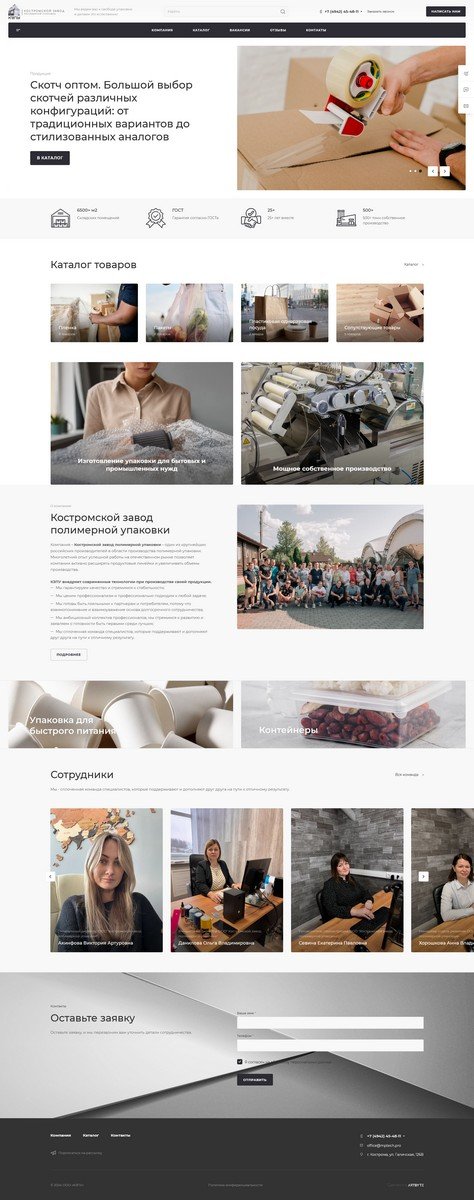 Костромской завод полимерной упаковки – это современное многофункциональное предприятие полного цикла, высокое качество продукции которого определяют современные технологии, материалы, оборудование и многолетний опыт работников компании. Собственное производство - гордость и преимущество предприятия.