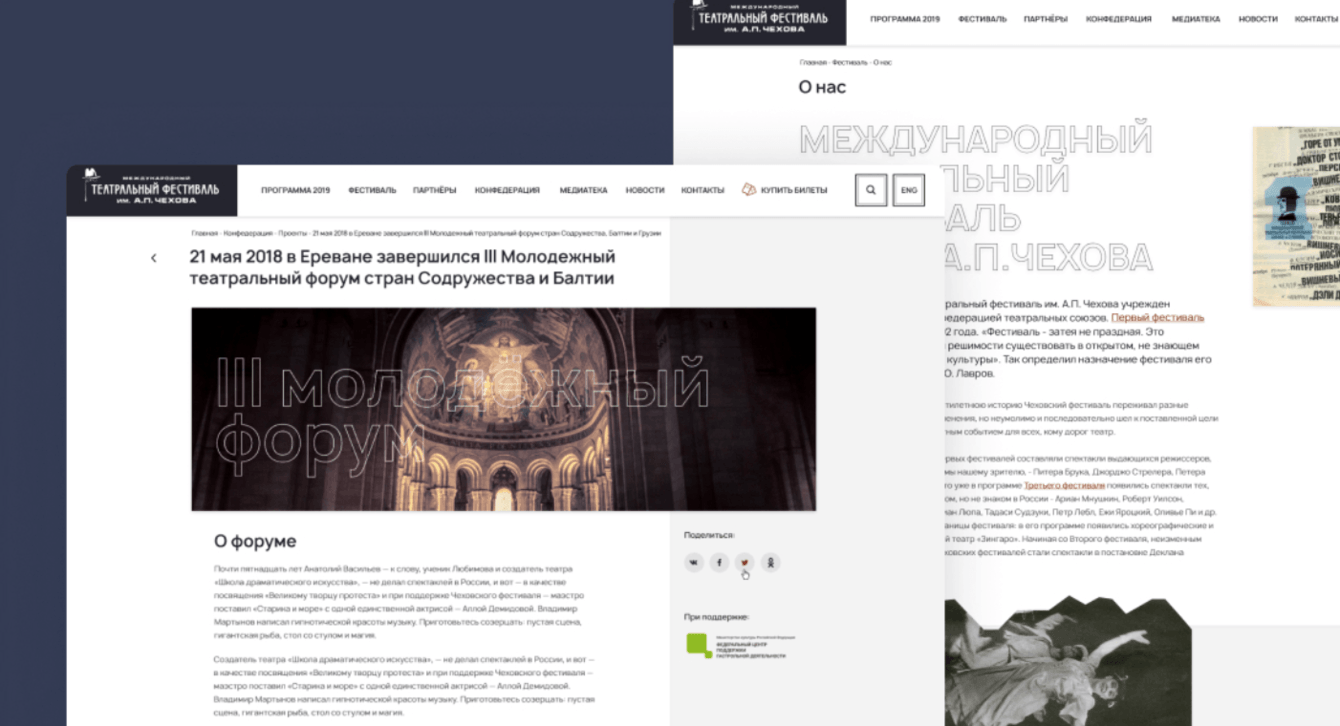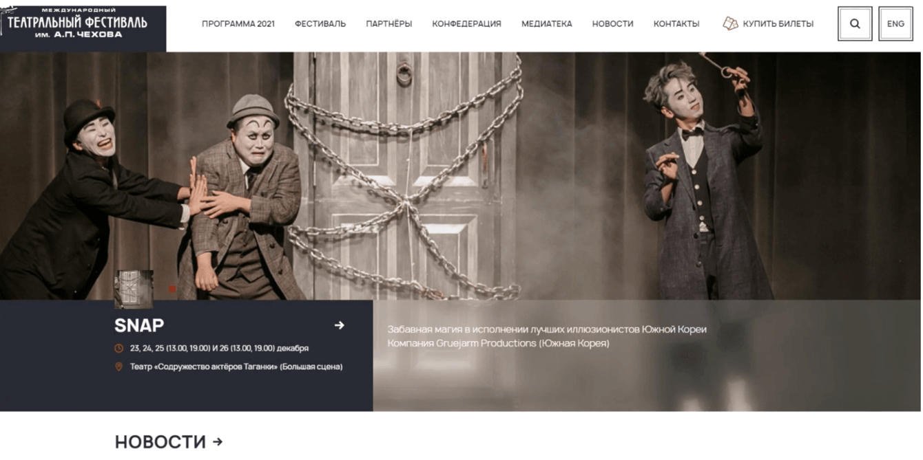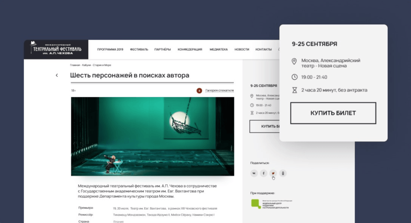 Заказчику требовалось создать современный, удобный сайт, позволяющий не только приобретать билеты на спектакли, но и выступать в качестве информационной площадки для ознакомления с историей фестиваля.