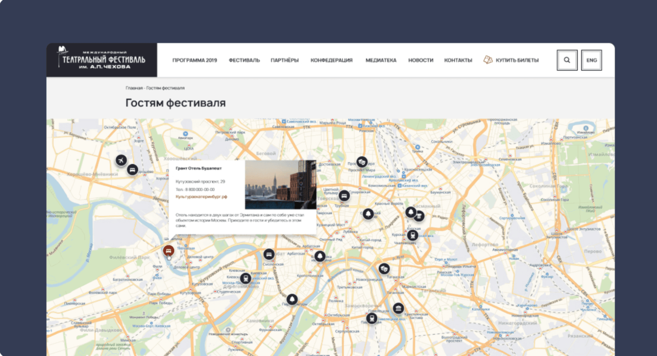 Еще одна отличительная особенность сайта раздел - «Гостям фестиваля». Раздел предназначен для пользователей, которые приезжают на фестиваль из других городов. Раздел снабжен интерактивной картой, которая отображает основные достопримечательности Москвы, отели и другие полезные места.