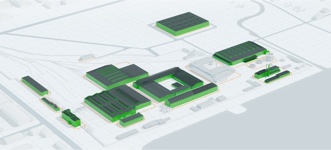 Кроме 3D-моделей продукции мы разработали интерактивную 3D-карту всего завода АМЗ. За основу для карты были взяты снимки завода с дрона, благодаря чему карта полностью соответствует плану предприятия.