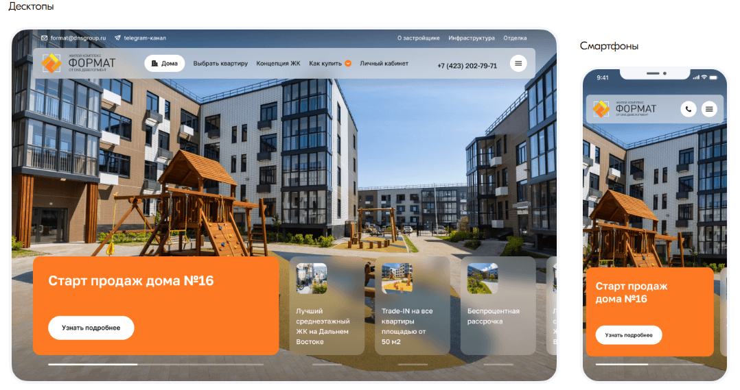 Новый сайт для проекта ЖК Формат позволил создать digital-инфраструктуру для одного из ключевых застройщиков Дальнего Востока. Мы реализовали комплексное решение, сочетающее современный дизайн с функциональностью, необходимой для рынка недвижимости. Одной из главных особенностей сайта является интерактивная карта, которая дает полную картину всех объектов застройщика. Пользователи могут легко выбирать интересующие их дома, просматривать подробную информацию и доступные для покупки объекты, что позволяет потенциальным покупателям быстрее планировать приобретение жилья.