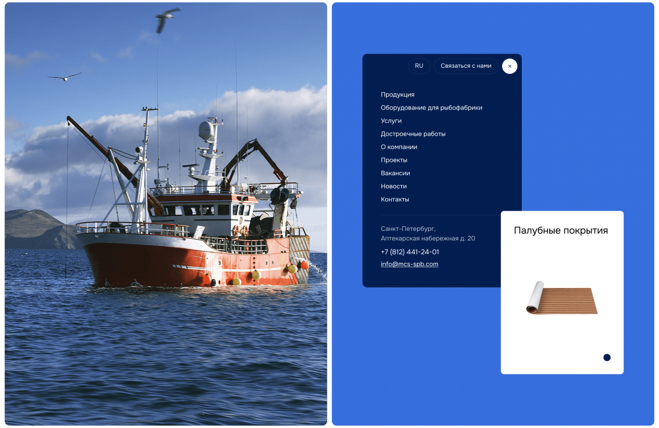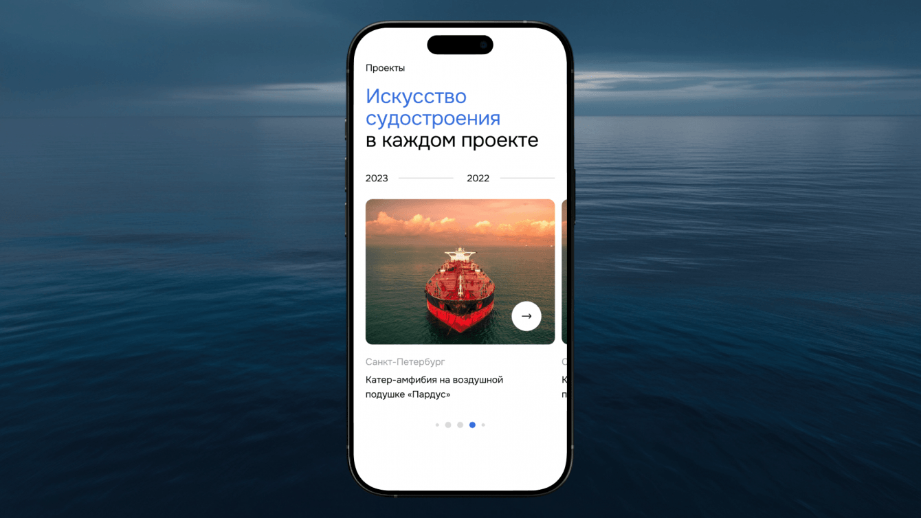 1) Использовали полноэкранные фотографии судов и параллакс-эффекты, чтобы передать мощь 23 000 м² производственных площадей. Анимация волн добавила динамики и подчеркнула морскую специфику.