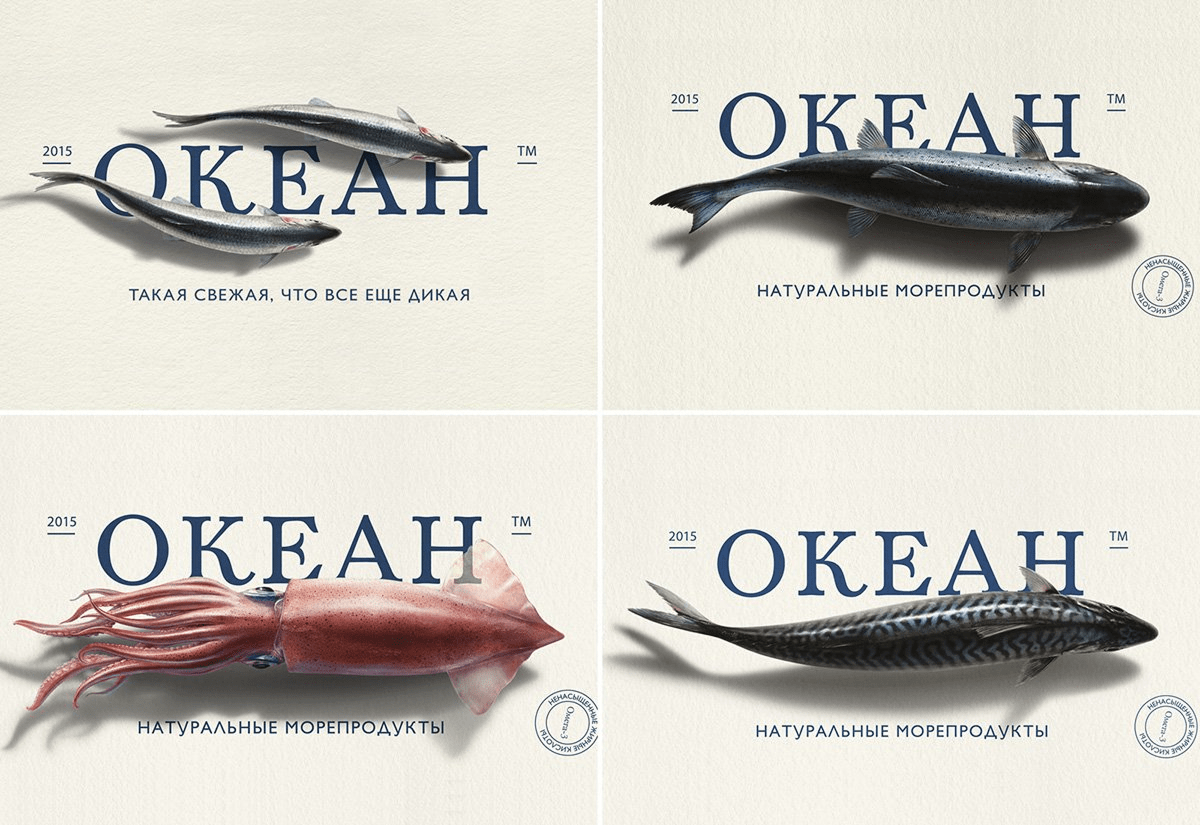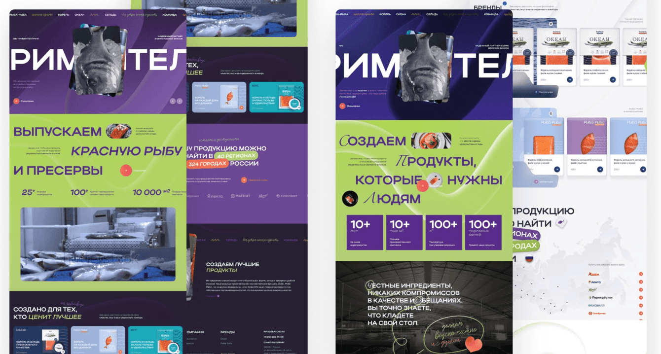 Для «Океана» мы вдохновились награждённой упаковкой: с помощью нейросетей «оживили» рыбу прямо с пачек, и теперь форель и сельдь плывут по экрану при скролле. Отдельным блоком рассказали про ребрендинг и фестивальные награды.