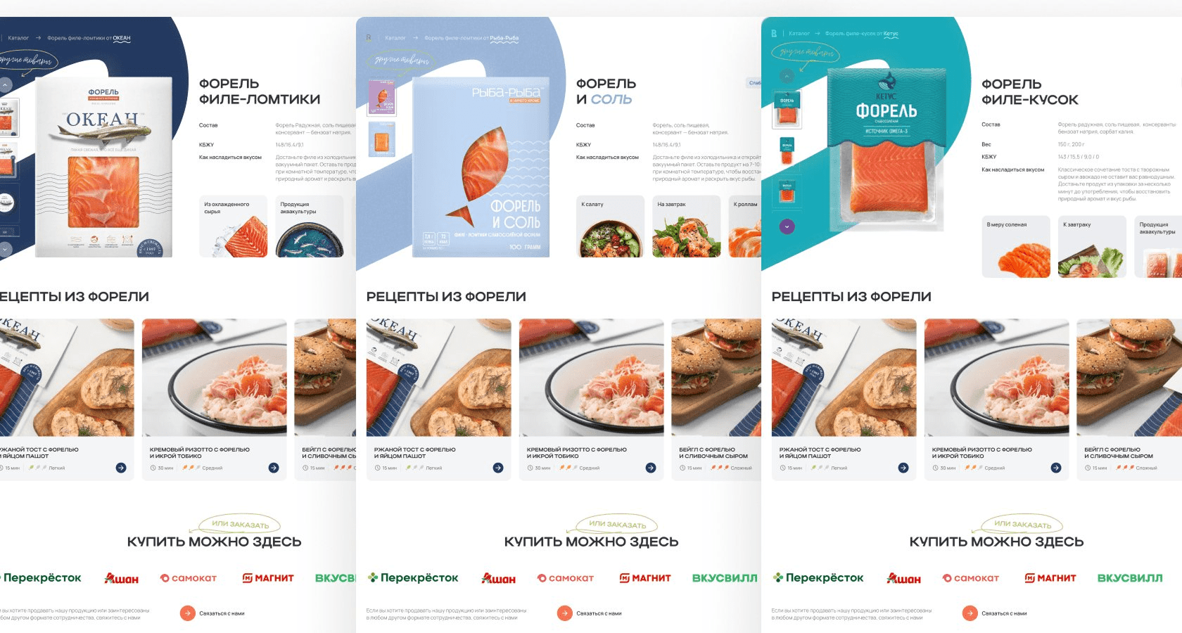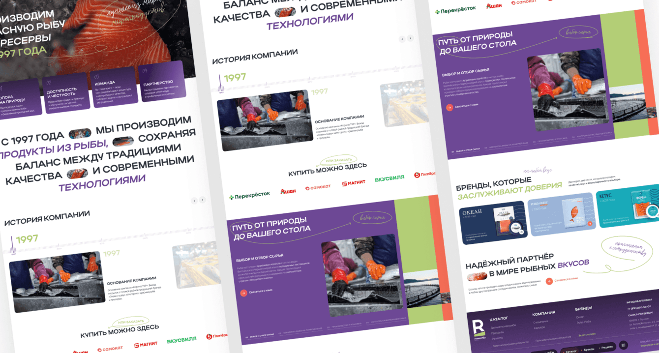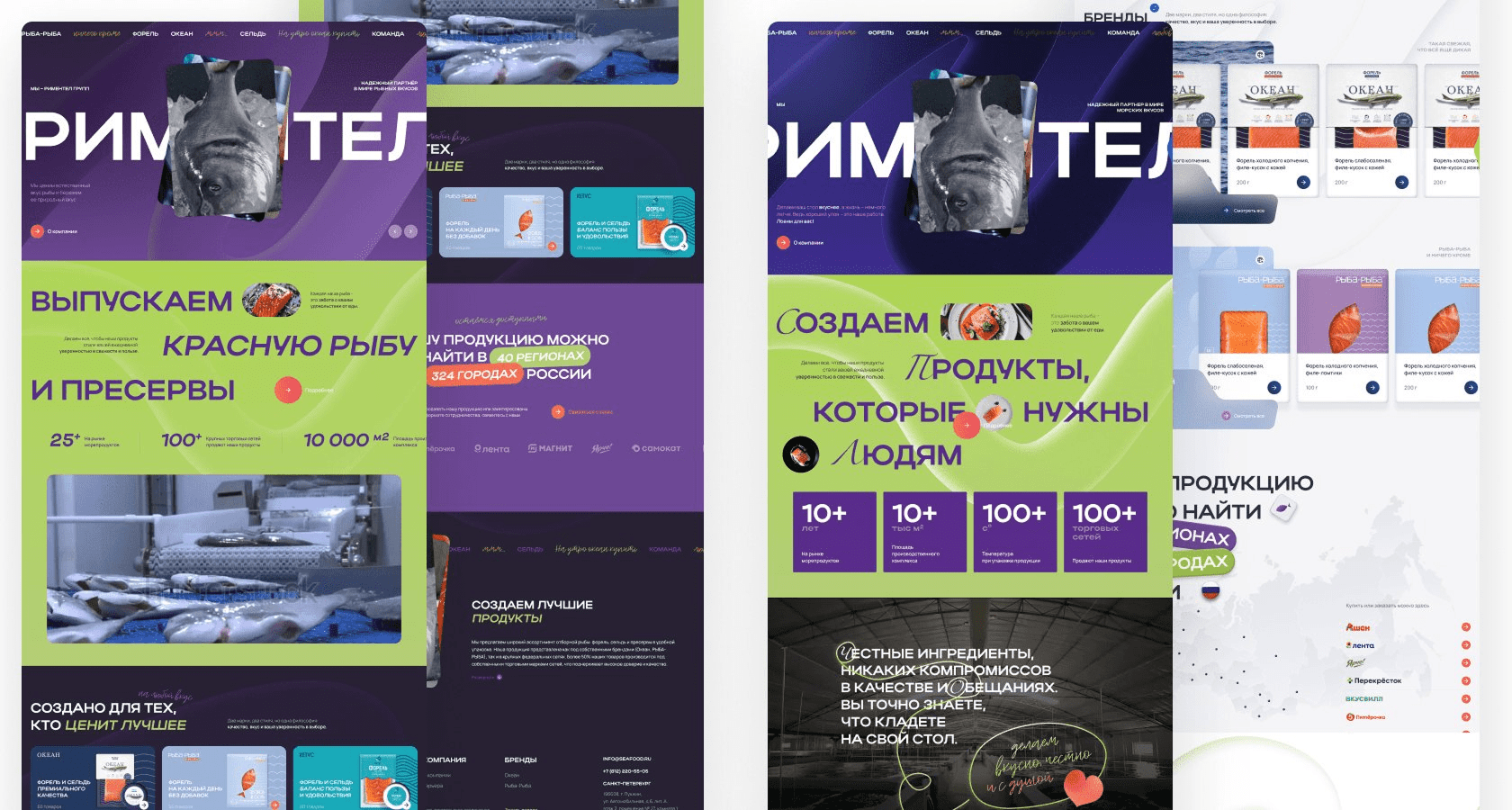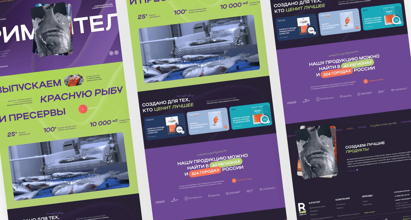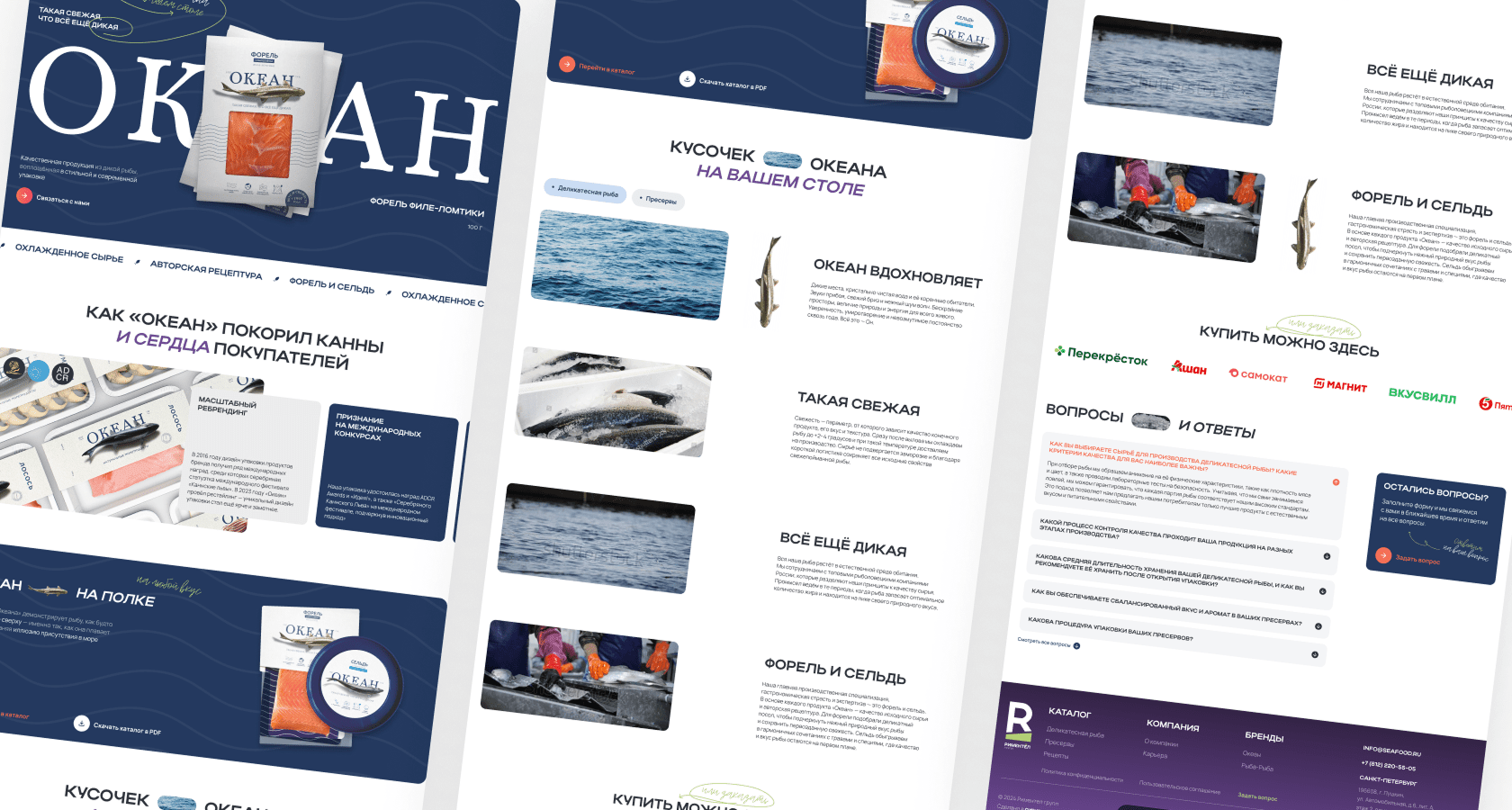 У «Риментела» три бренда — «Океан», «Рыба-Рыба» и «Кетус», и каждому мы сделали отдельный лендинг. Структура у них похожая, но визуал разный: у каждого бренда есть свой характер, фирменные цвета и стиль, и это нужно было показать.
