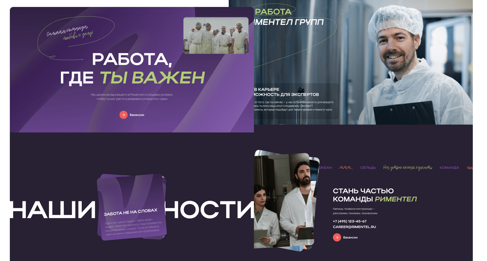 Страница о карьере в «Риментеле» получилась небольшой, но очень живой и человечной. Вместо сухих формулировок — атмосфера: на первом экране видео о жизни компании, ниже — анимированные карточки с ценностями, которые накладываются стопкой друг на друга.