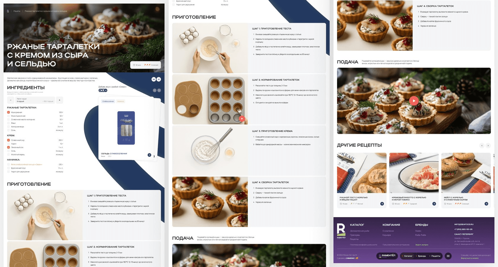Один из самых вкусных разделов сайта — рецепты из продукции брендов «Риментела». Здесь всё сделано так, чтобы захотелось готовить и возвращаться за новыми идеями.