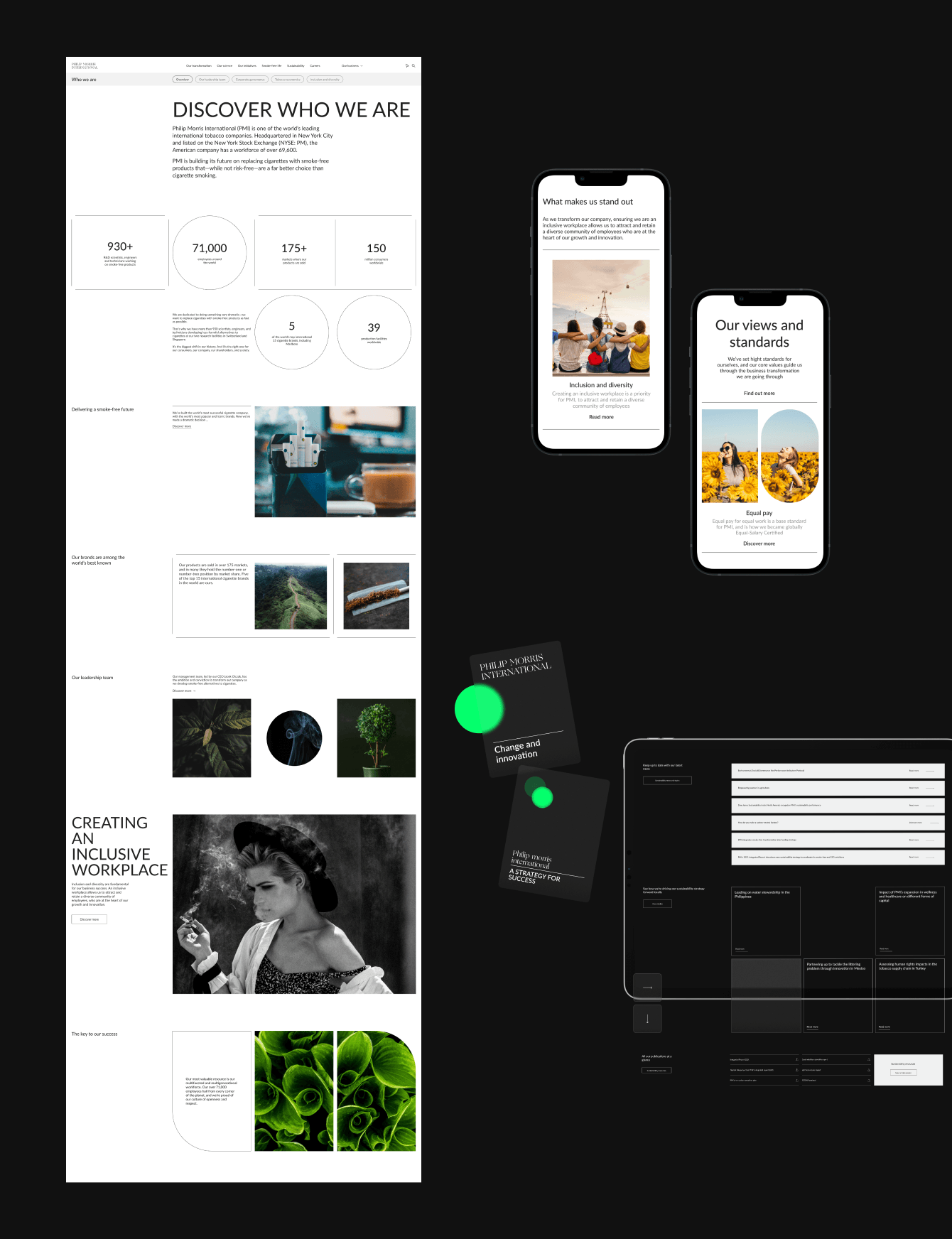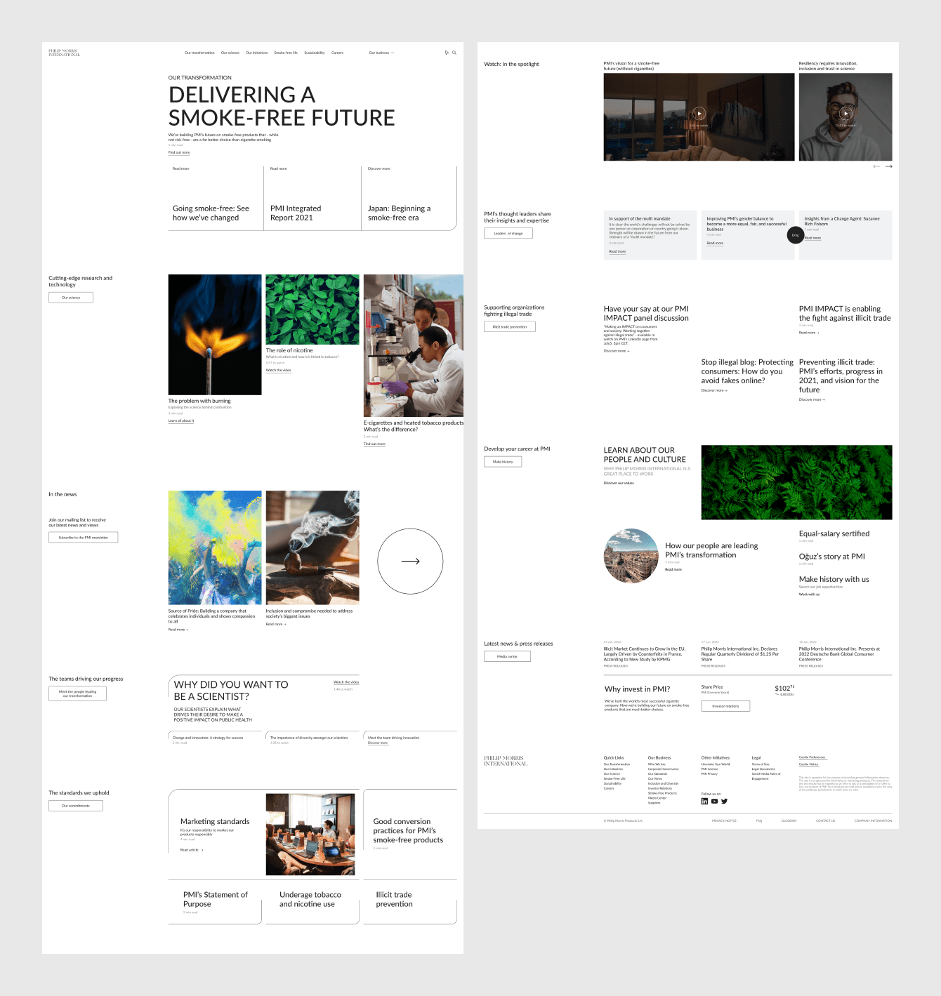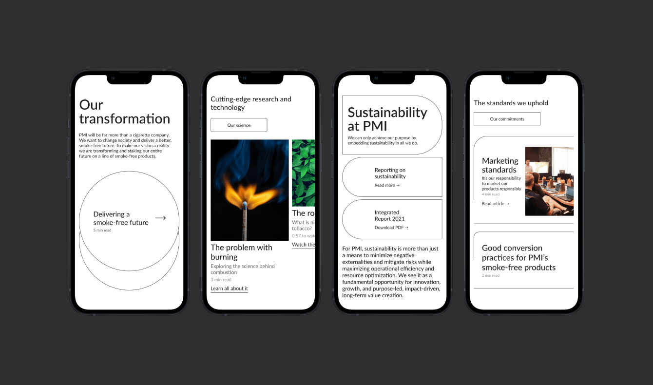 Результатом нашей работы стал динамичный и стильный сайт PMI, который увлекает посетителей в мир истории и ценностей компании, а также знакомит их с ее продукцией. Благодаря редизайну, ресурс получил не только современный внешний вид, но и интуитивно понятную навигацию, что делает взаимодействие с ним удобным и интересным.