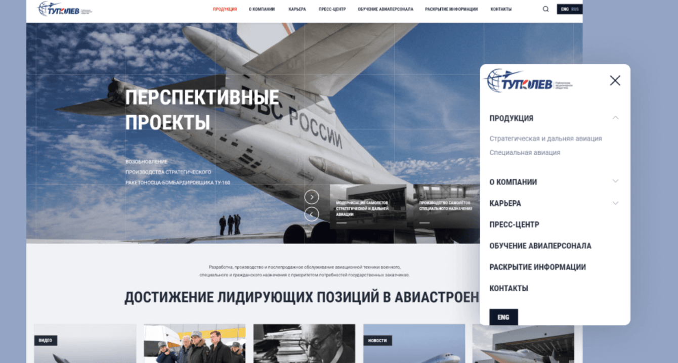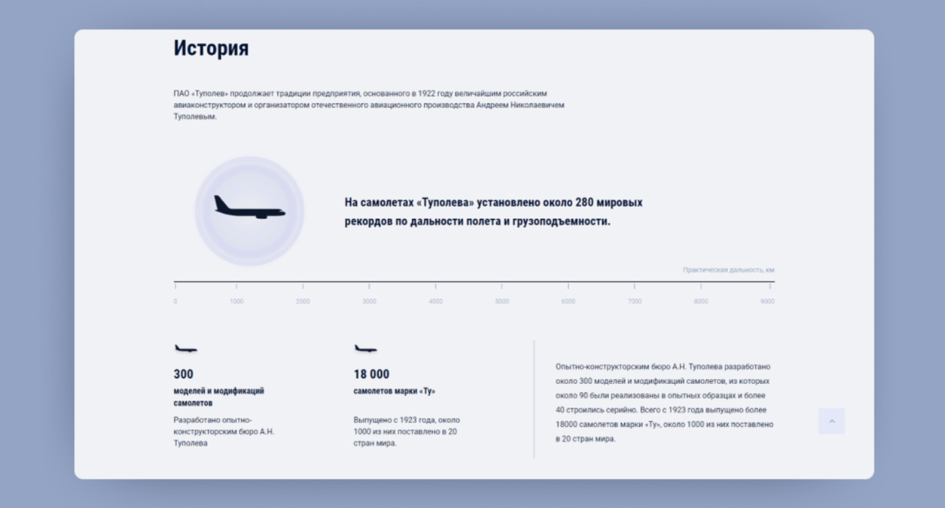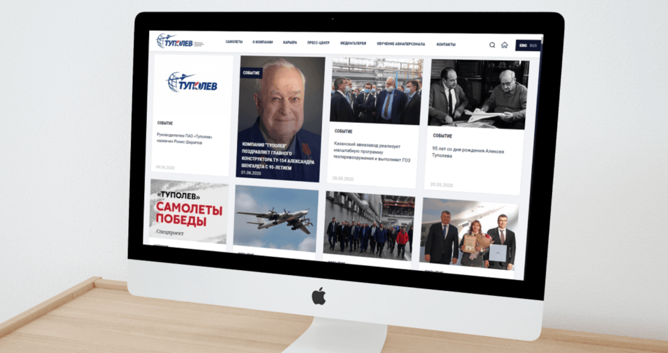 1. На сайте был переработан раздел пресс-центра. И полностью переделан раздел «История компании». Раньше было много текста без картинок и мало фактов. На новом сайте история находится в разделе «О компании», там же рекорды и краткая информация о ПАО «Туполев». Около 50 страниц с разными адресами мы сократили до одной.