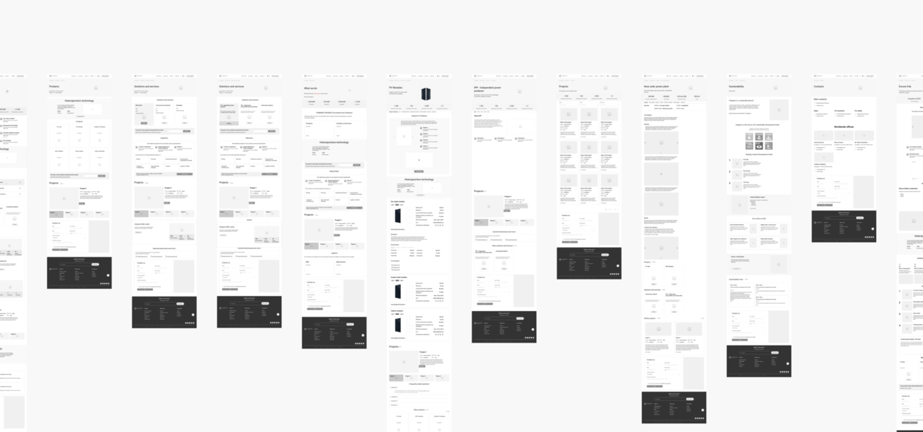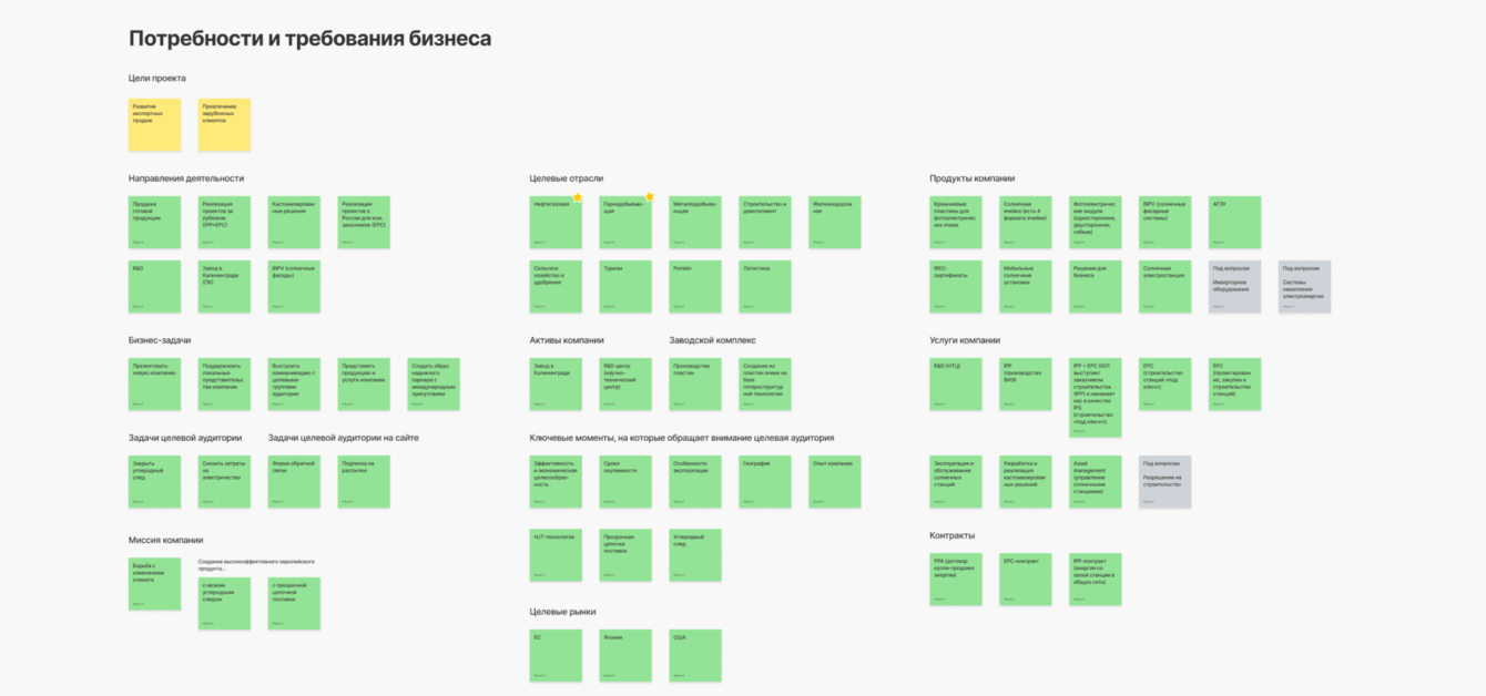 Начали со сбора бизнес-требований. Провели ряд интервью с руководителями разных направлений в компании: b2b, маркетинг, продажа готовой продукции, независимое производство электроэнергии (IPP). Узнали о деятельности компании, целевой аудитории проекта, собрали требования к сайту и определили продукцию и услуги, которые планируется размещать на сайте.