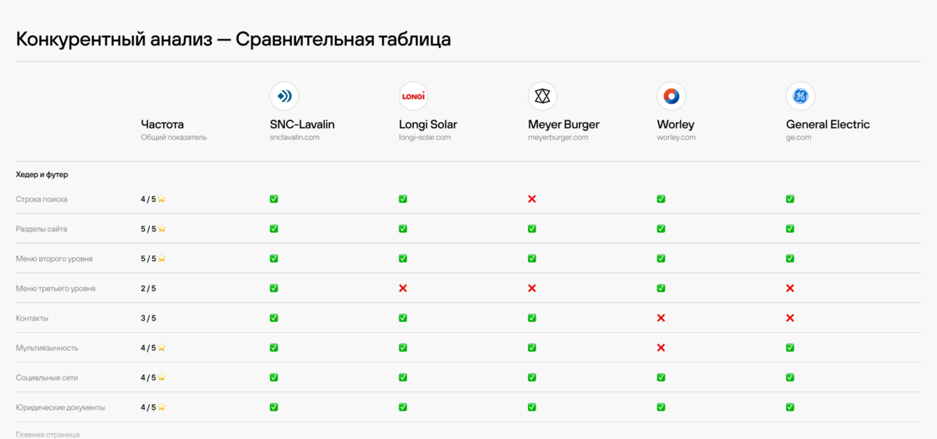 Охватывал не только контентные страницы сайта, но и сквозные элементы: хедер, футер, внутреннюю навигацию. Дополнительно создали сравнительную таблицу, которая показывает, какие страницы и блоки чаще всего используют конкуренты. В результате выделили тренды корпоративных сайтов. Например, все компании делают ставку на устойчивое развитие и ESG-повестку.