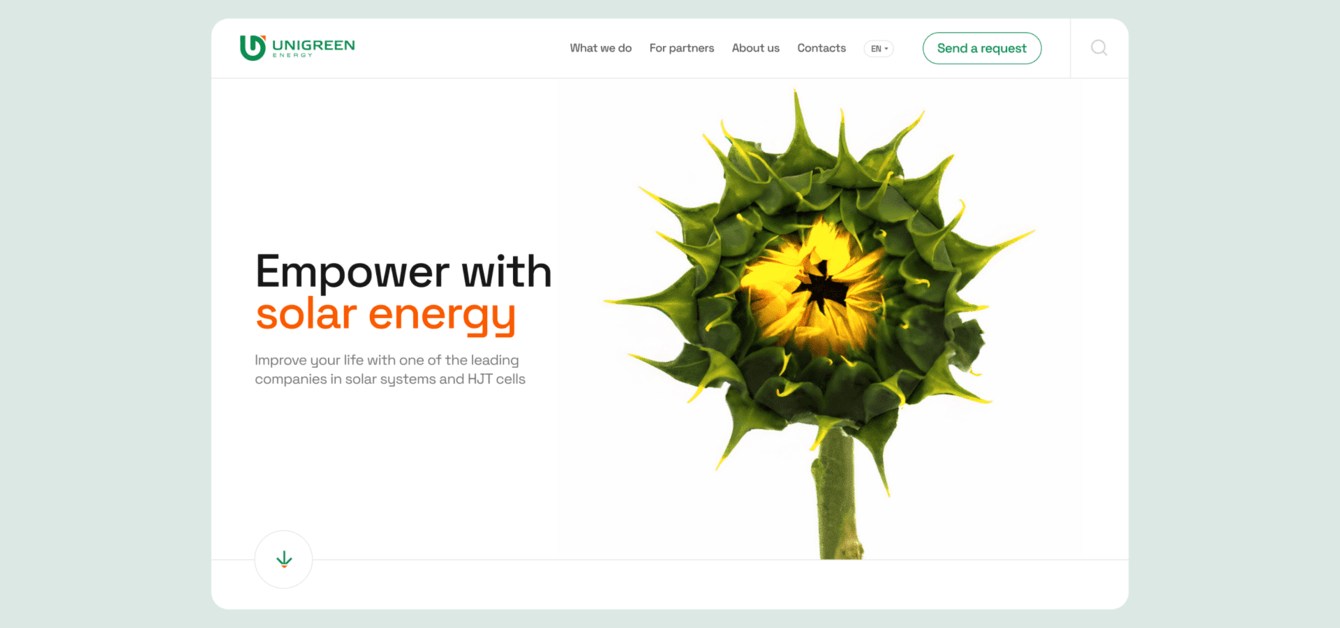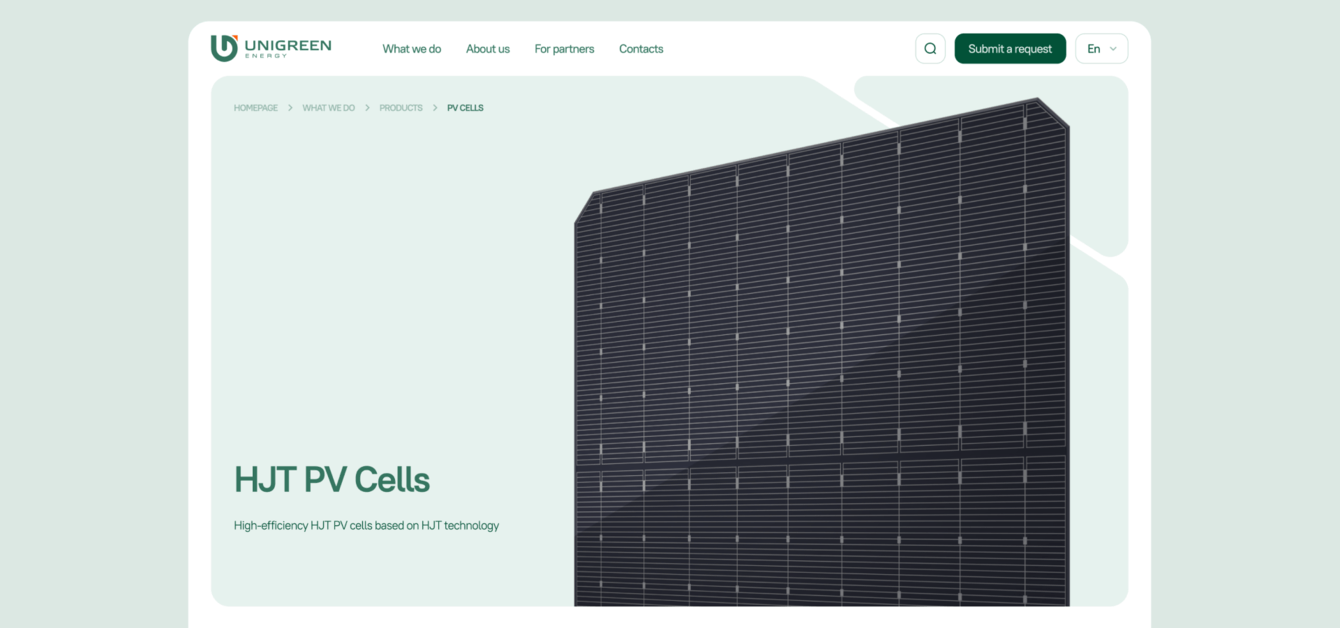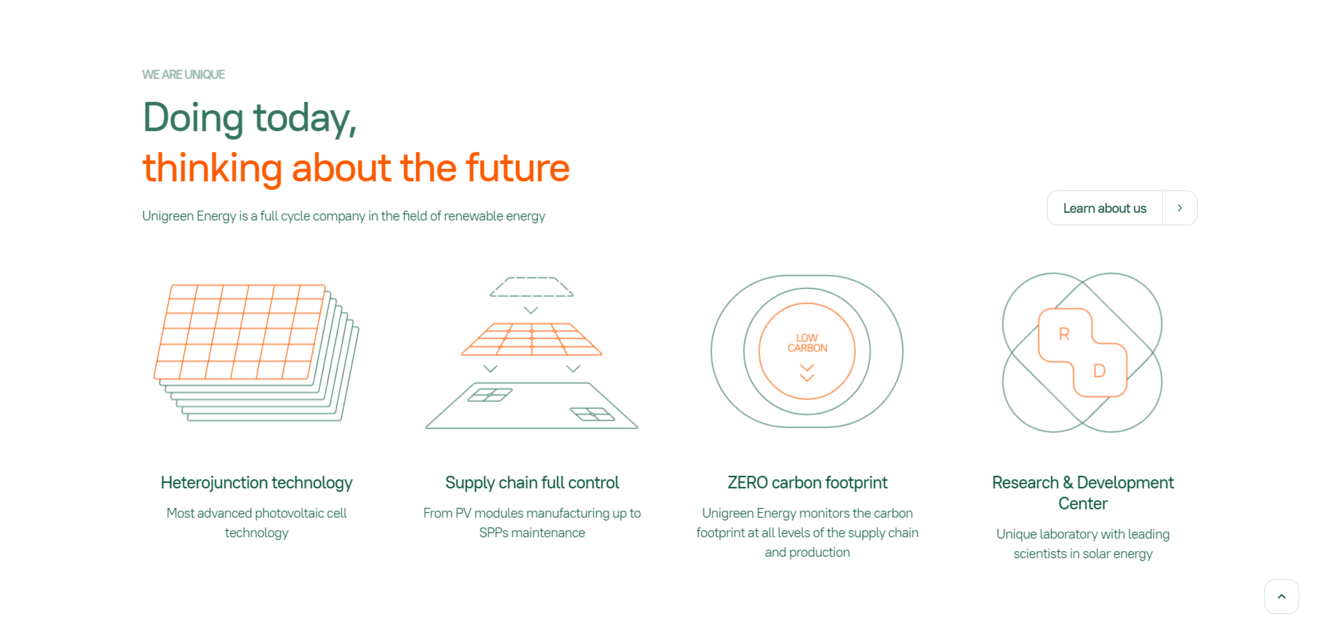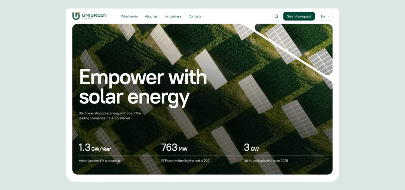 Новый сайт представляет собой полноценный ресурс с разветвлённой структурой. Содержит необходимые разделы и страницы с нужной пользователям информацией. Например, проработанный раздел «Что мы делаем» включает не только продукты, но и решения, услуги, проекты компании, информацию о производстве, используемых технологиях, научно-техническом центре. Страницы помогают закрывать информационные ожидания целевой аудитории и позиционируют Unigreen Energy как передовую, динамично развивающуюся компанию.