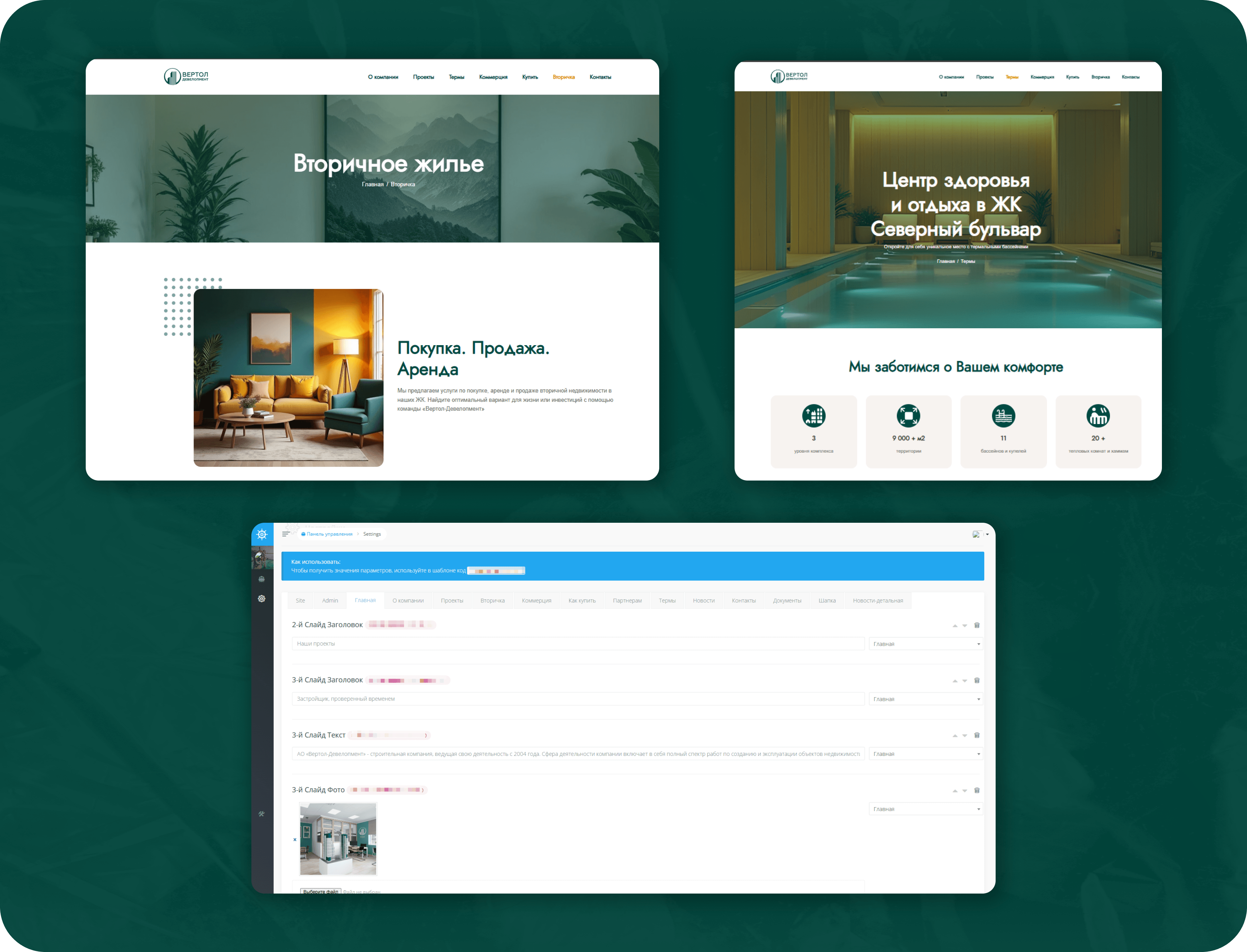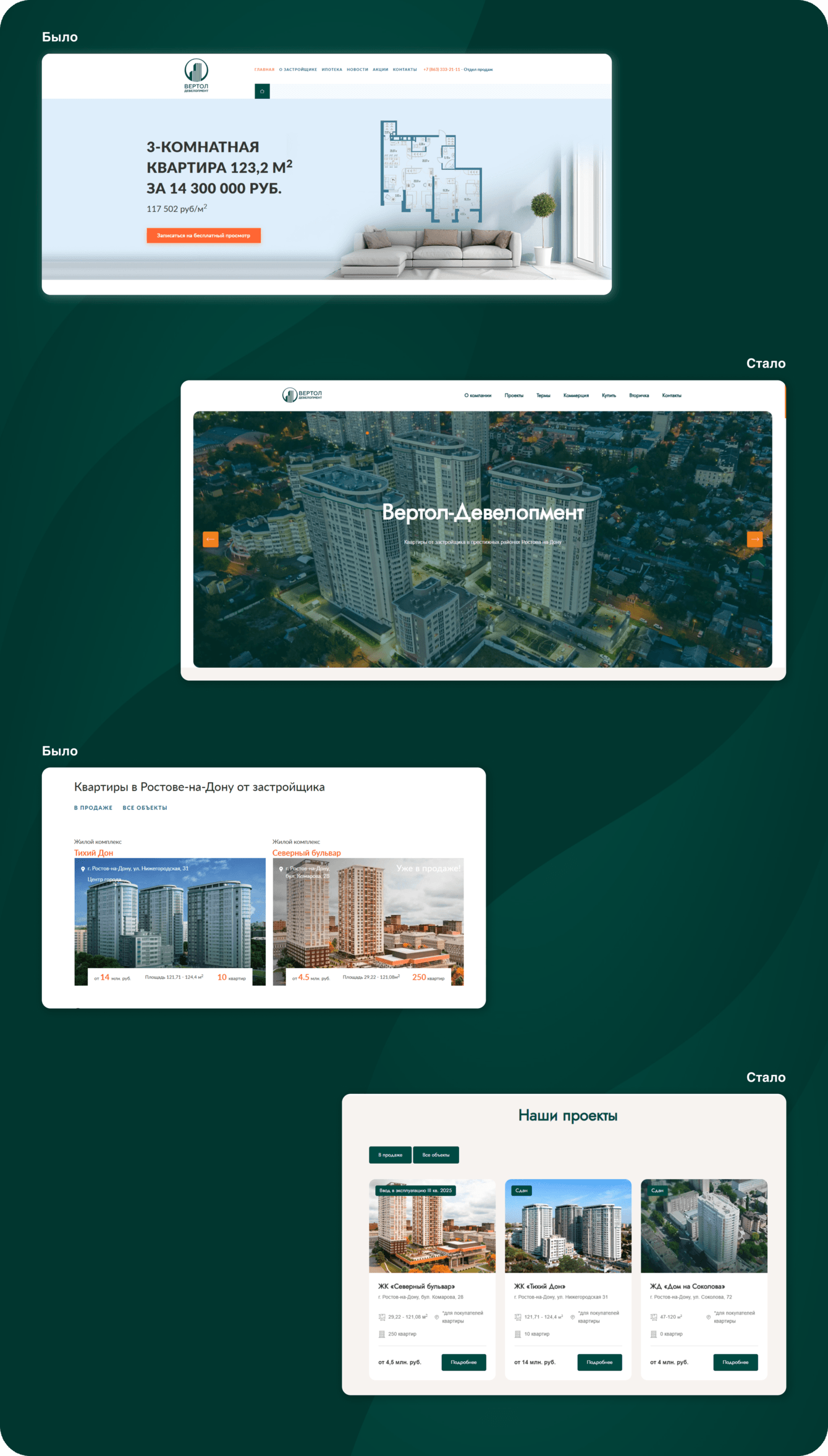 В результате получился современный, удобный и функциональный корпоративный сайт, полностью отвечающий задачам клиента и ожиданиям пользователей. Новый сайт «Вертол-Девелопмент» стал не только визитной карточкой компании, но и эффективным инструментом для взаимодействия с клиентами.