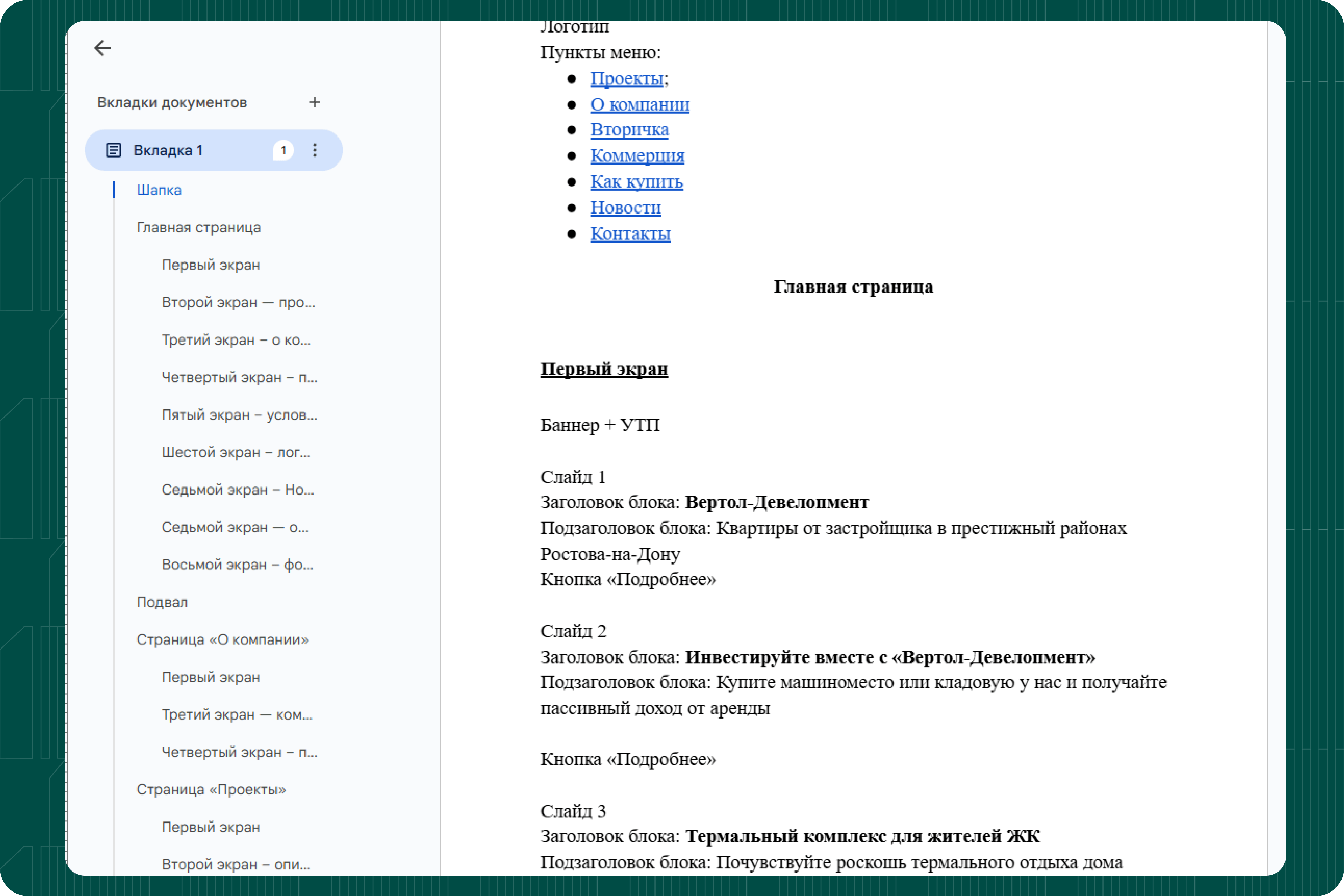 Разработать современный корпоративный сайт для АО «Вертол-Девелопмент» – одного из ведущих застройщиков Ростова-на-Дону. Компания занимается строительством и девелопментом с 2004 года, а недавно расширила свою деятельность, став агентством недвижимости. Новый сайт должен не только презентовать компанию и её проекты, но и улучшить пользовательский опыт, сделав информацию доступной и понятной.