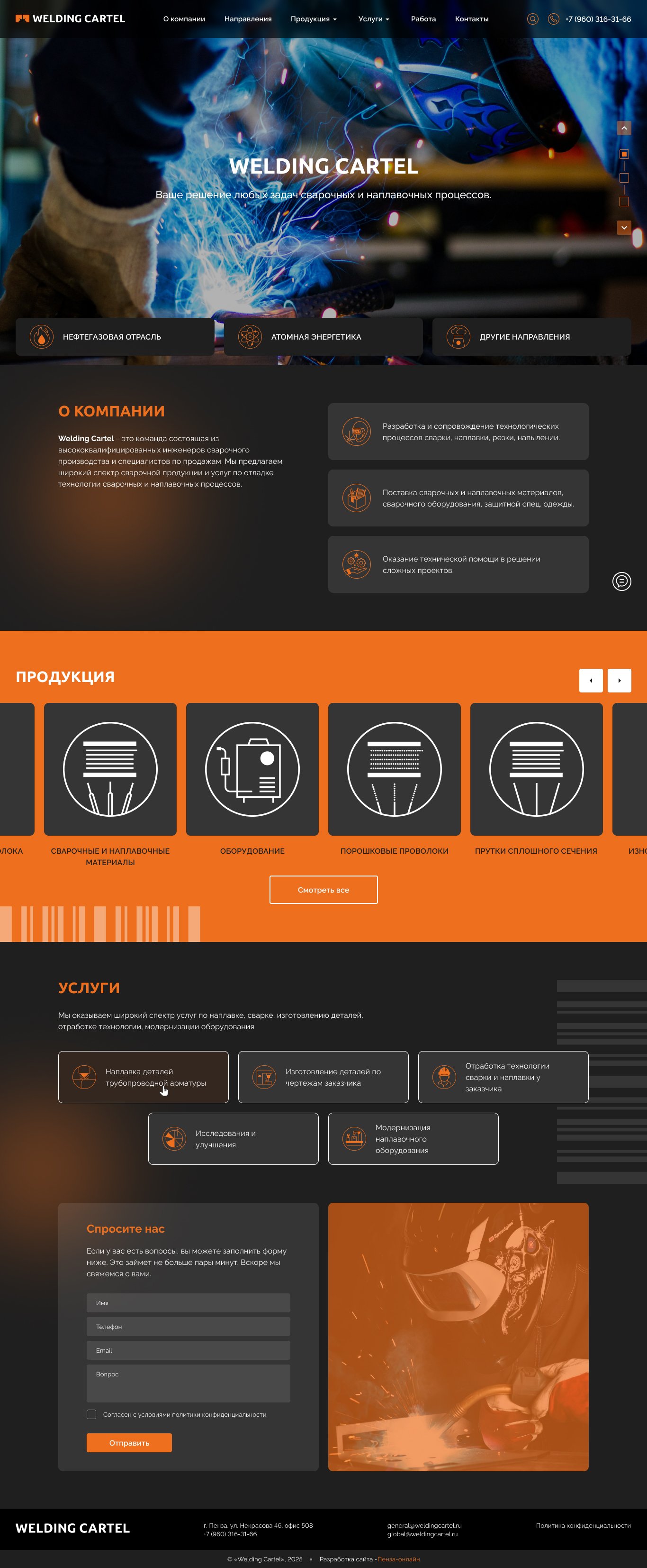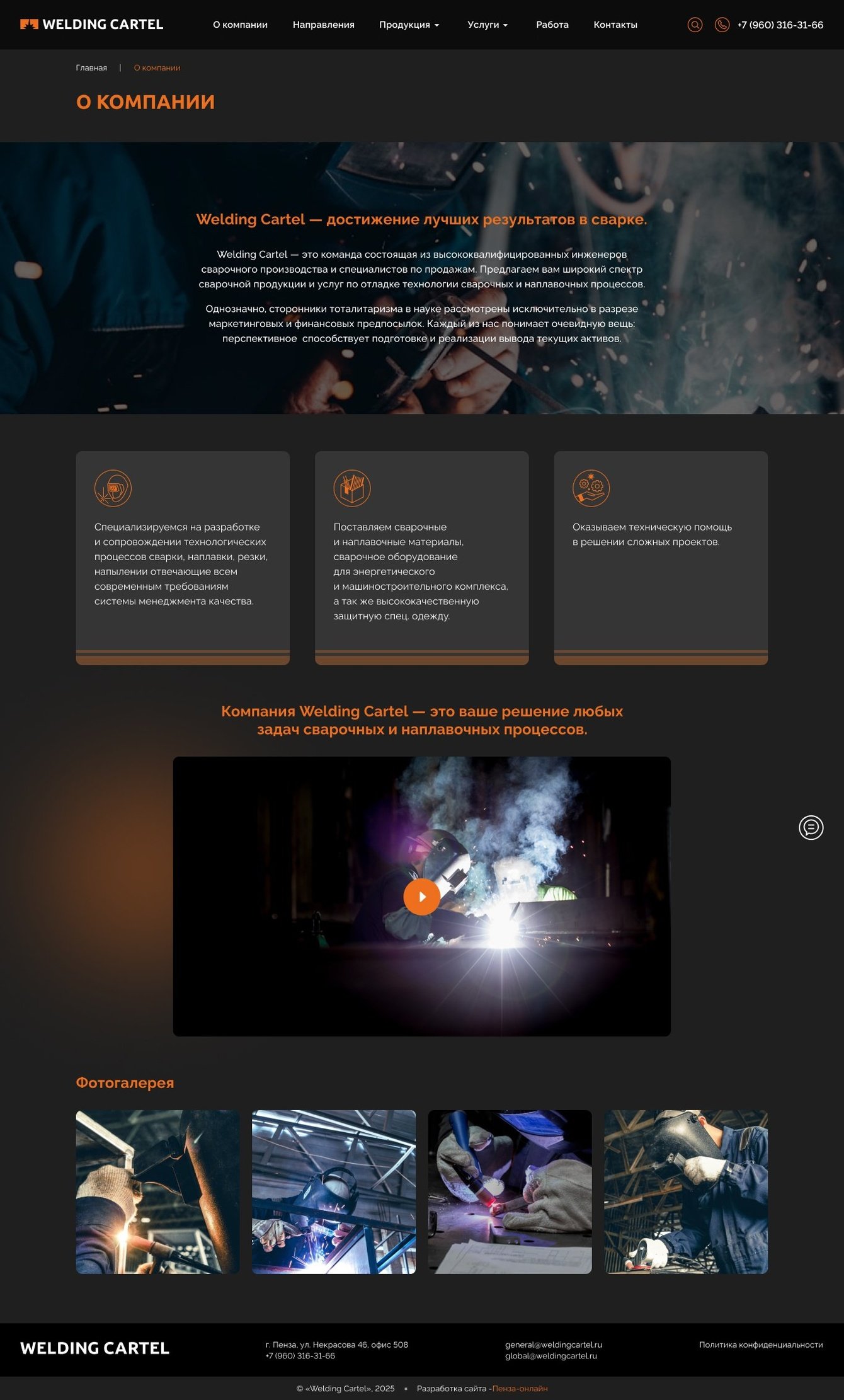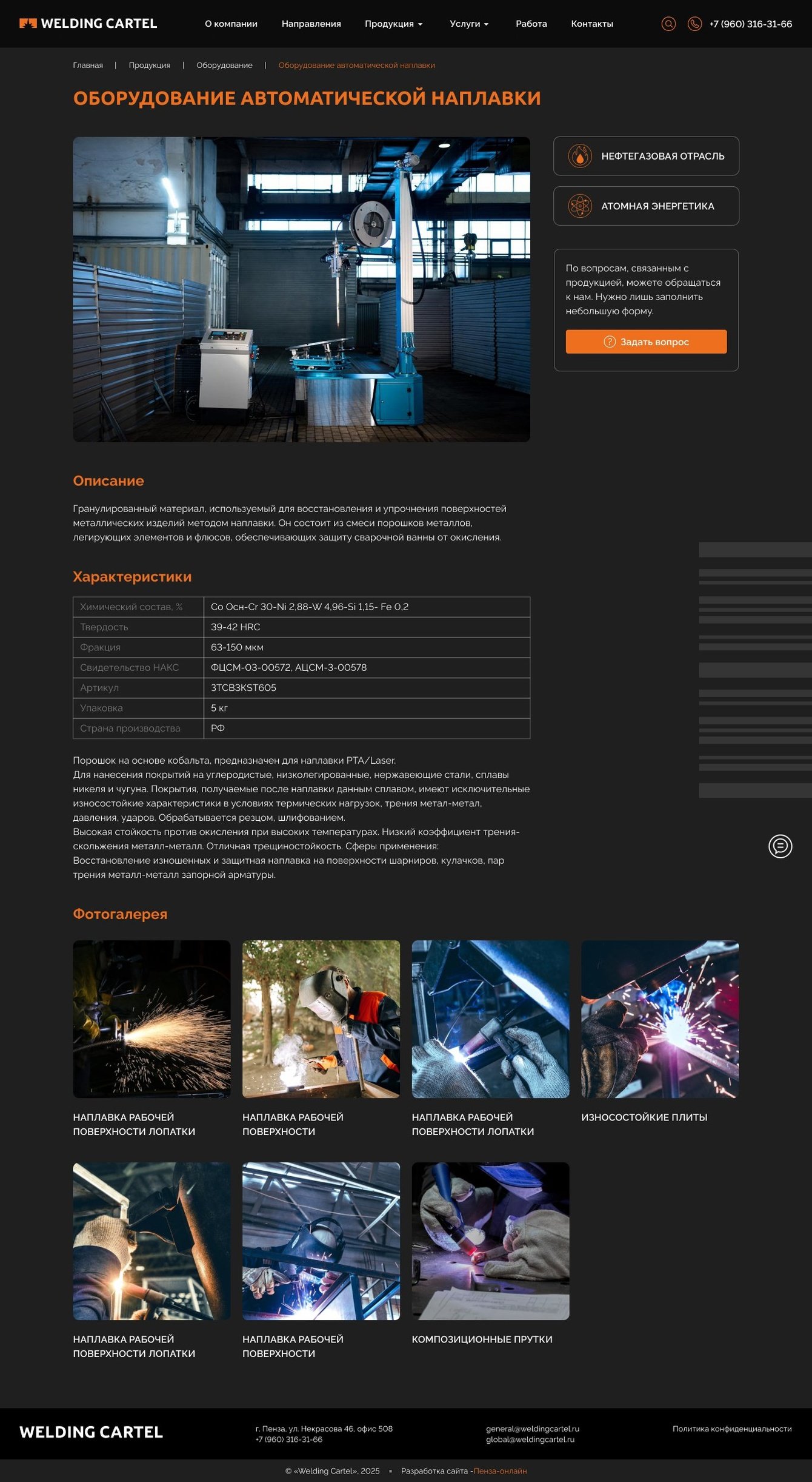 Welding Cartel - это компания, занимающаяся продажей сварочных материалов и оборудования для сварки, а также предоставлением услуг высококвалифицированных инженеров сварочного производства.
