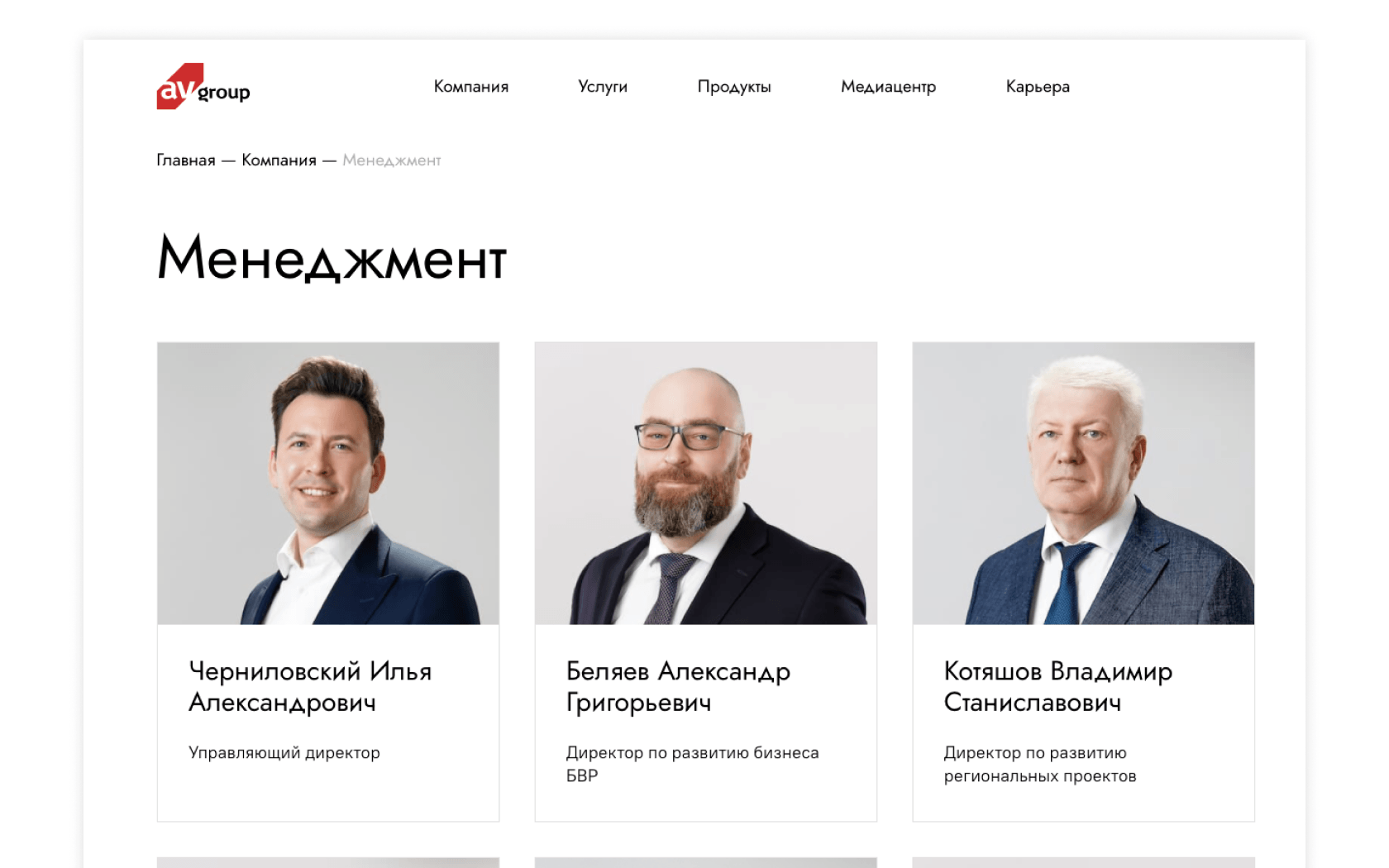 Сайт сделан на платформе «1С-Битрикс» с возможностью управления контентом силами контент-менеджера. Мы также обучили сотрудников AV Group работе с админкой сайта и подготовили для них детальную инструкцию.