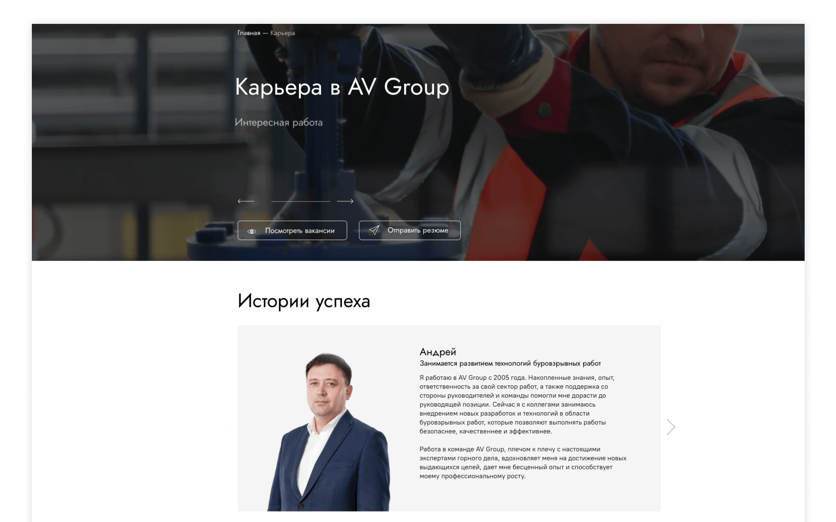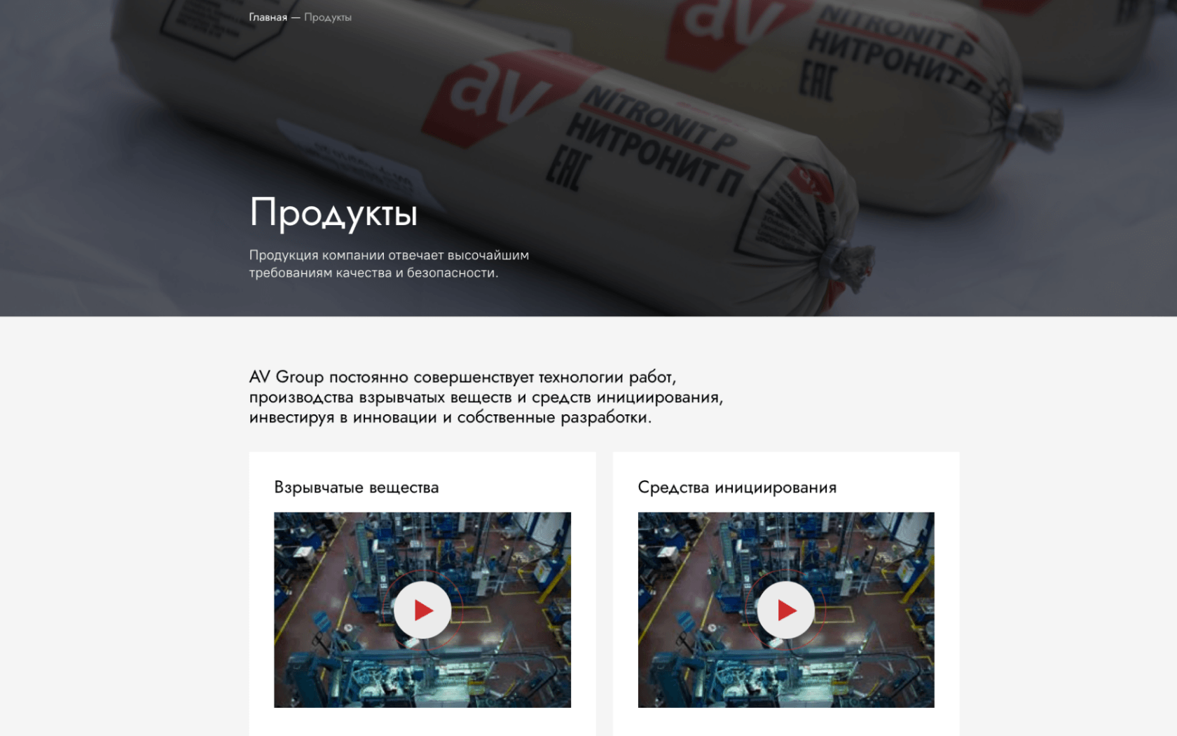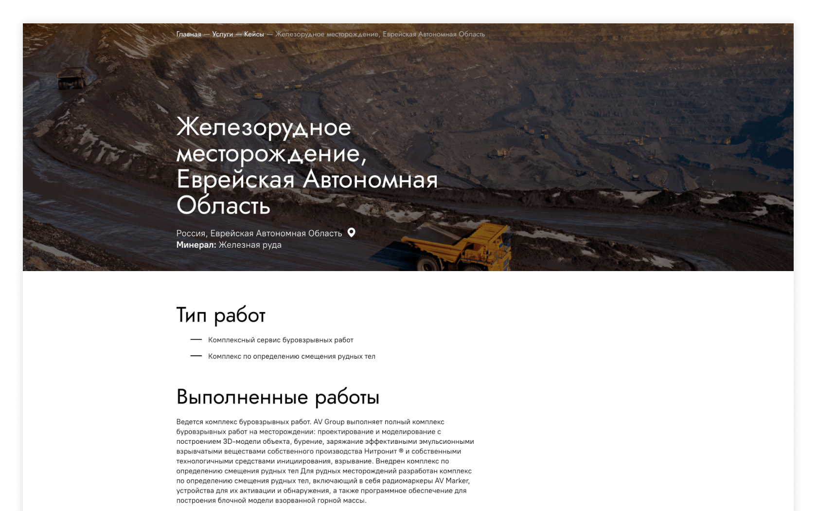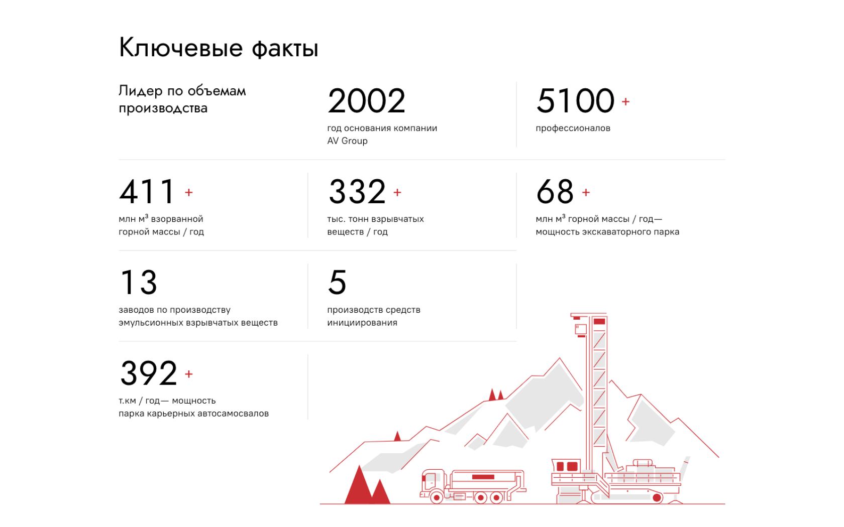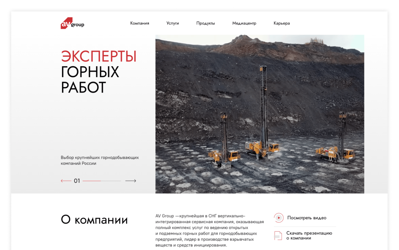 Мы провели агрегацию требований проекта и сформулировали ключевое сообщение сайта: «AV Group — крупнейшая в СНГ вертикально-интегрированная сервисная компания, оказывающая полный комплекс услуг по ведению открытых и подземных горных работ для горнодобывающих предприятий, лидер в производстве взрывчатых веществ и средств инициирования.».
